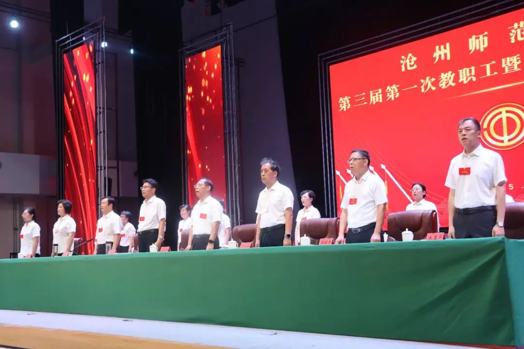 共商发展大计,凝聚奋进力量。6月19日上午8:00,在庄严的国歌声中,太阳集团第三届第一次教职工暨工会会员代表大会在齐越大讲堂召开。党委书记云电军,校长张占平,党委副书记范小振,党委常委、副校长高颖、周振平、郭玉秀、朱蓬华出席大会,党委副书记邢树军主持开闭幕式。