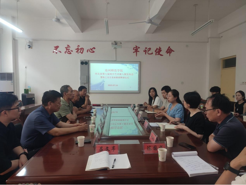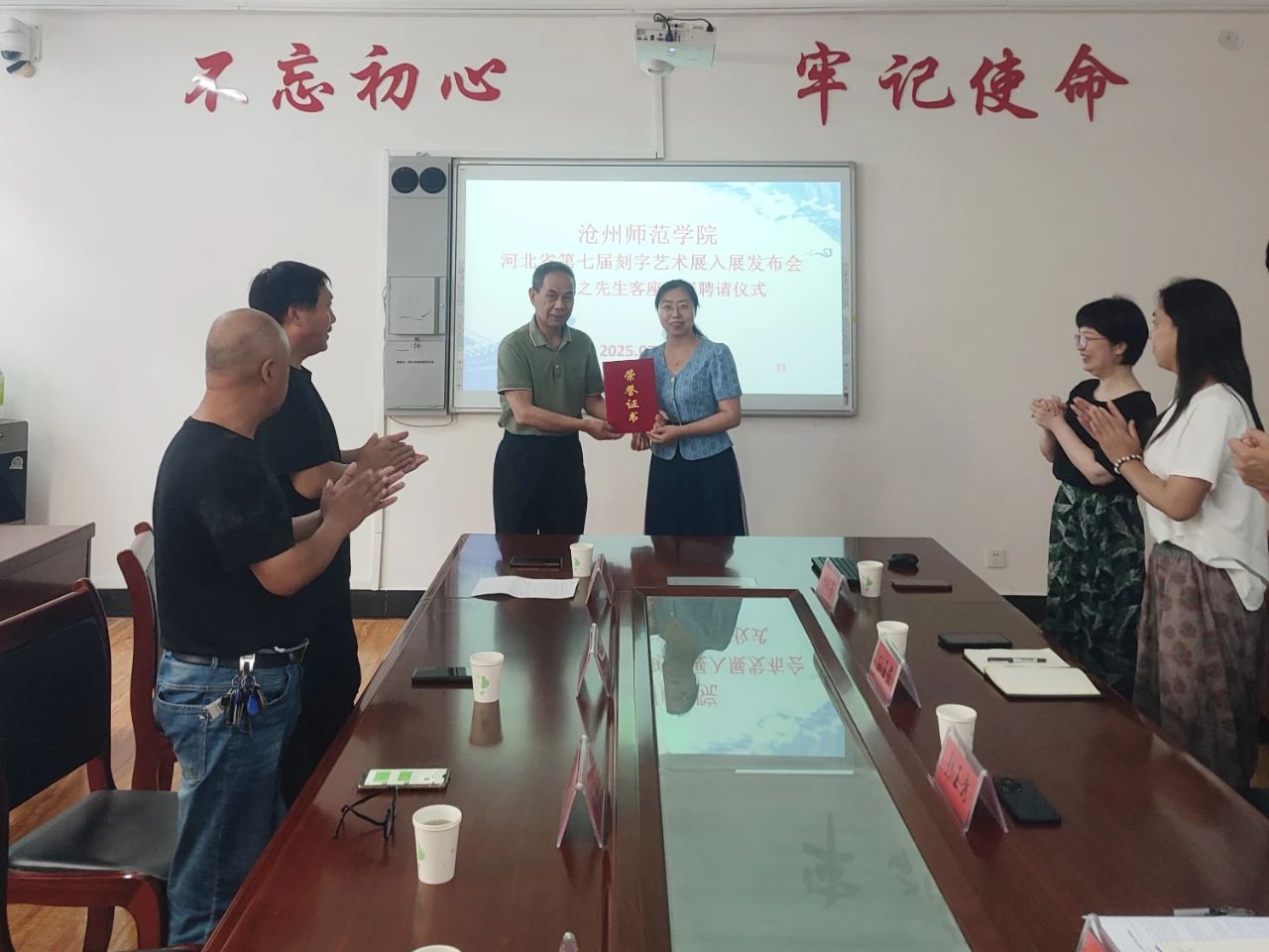 7月14日,太阳集团tcy8722网站河北省第七届刻字艺术展入展发布会暨张之先生客座教授聘请仪式在太阳集团tcy8722网站文学院举行,庆祝太阳集团书法学专业学生在河北省第七届刻字艺术展中取得佳绩。 中国书协刻字委员会原副主任张之,沧州市书协副主席兼秘书长冯子平,沧州市书协原副主席房世良,沧州市书协副秘书长黄子麟应邀参加发布会。太阳集团tcy8722网站党委常委、副校长郭玉秀,文学院院长王金萍,副院长孙玉安,书法学科负责人田雨潇、书法教研室主任刘晓霞与专任教师代表和获奖入展学生代表共同参加了此次活动。
