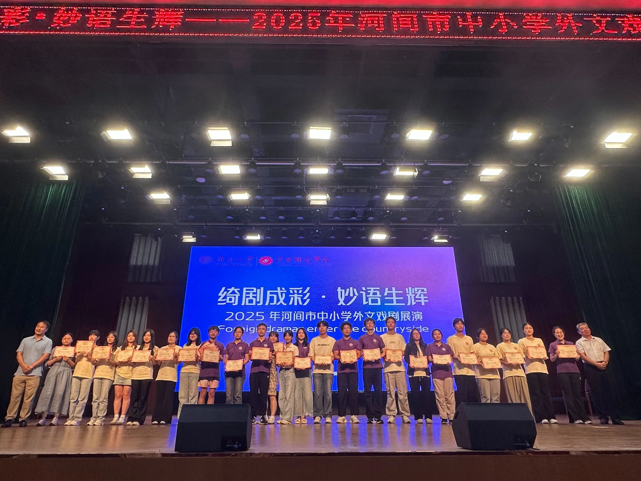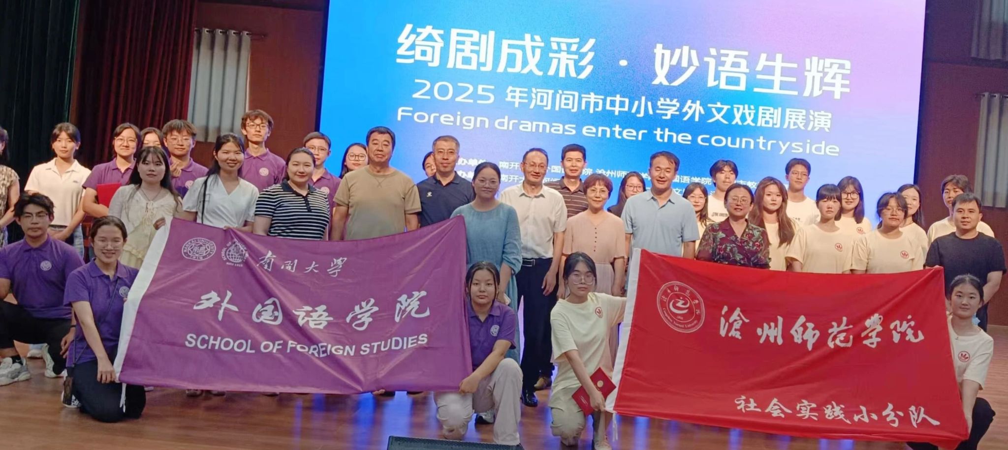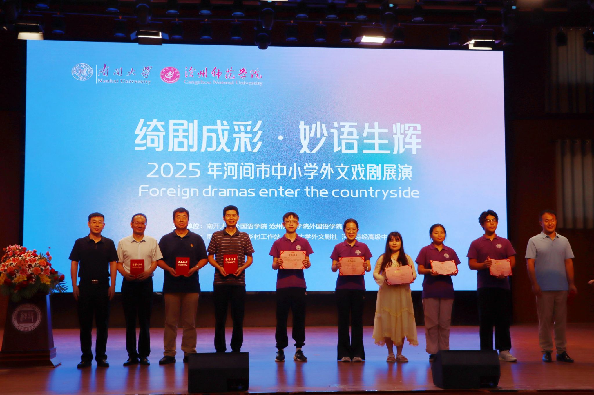 南开大学河间乡村工作站校友站长蔡印同和河间市副市长张子良为师生志愿者颁发“荣誉村民”证书,感谢两校师生为乡村外语教育播撒的星光。 “外文戏剧进乡村”是南开大学发扬外国语学院外文剧社的优良传统,积极响应乡村振兴和“一带一路”倡议,依托南开大学河间乡村工作站和教育部教学科研一体化外语教学研究虚拟教研室,发起的社会实践公益项目。自2025年寒假启动之初,外国语学院院长王娜、副院长徐广林就组建优秀师生团队全面参与其中。寒假前夕,志愿者们进行了一个多月的线上活动,开展剧本编译、讲解戏剧知识、发音示范纠正等工作。寒假期间,志愿者们赴河间各地进行面对面指导和实验演出。暑期期间,两校师生志愿者深入河间诗经高级中学、河间十四中、八里庄小学、米各庄一中、北老生中学、北司徒小学等10所中小学,开展了两周的线上教学和两周的现场排练指导工作。从“怯于开口”到“自信演绎”,从“机械跟读”到“情感表达”……河间的村里娃在大学生志愿者们的耐心指导下,演绎出了《哈姆雷特》《花木兰》《愚公移山》《李尔王》《音乐之声》等一幕幕精彩戏剧。
