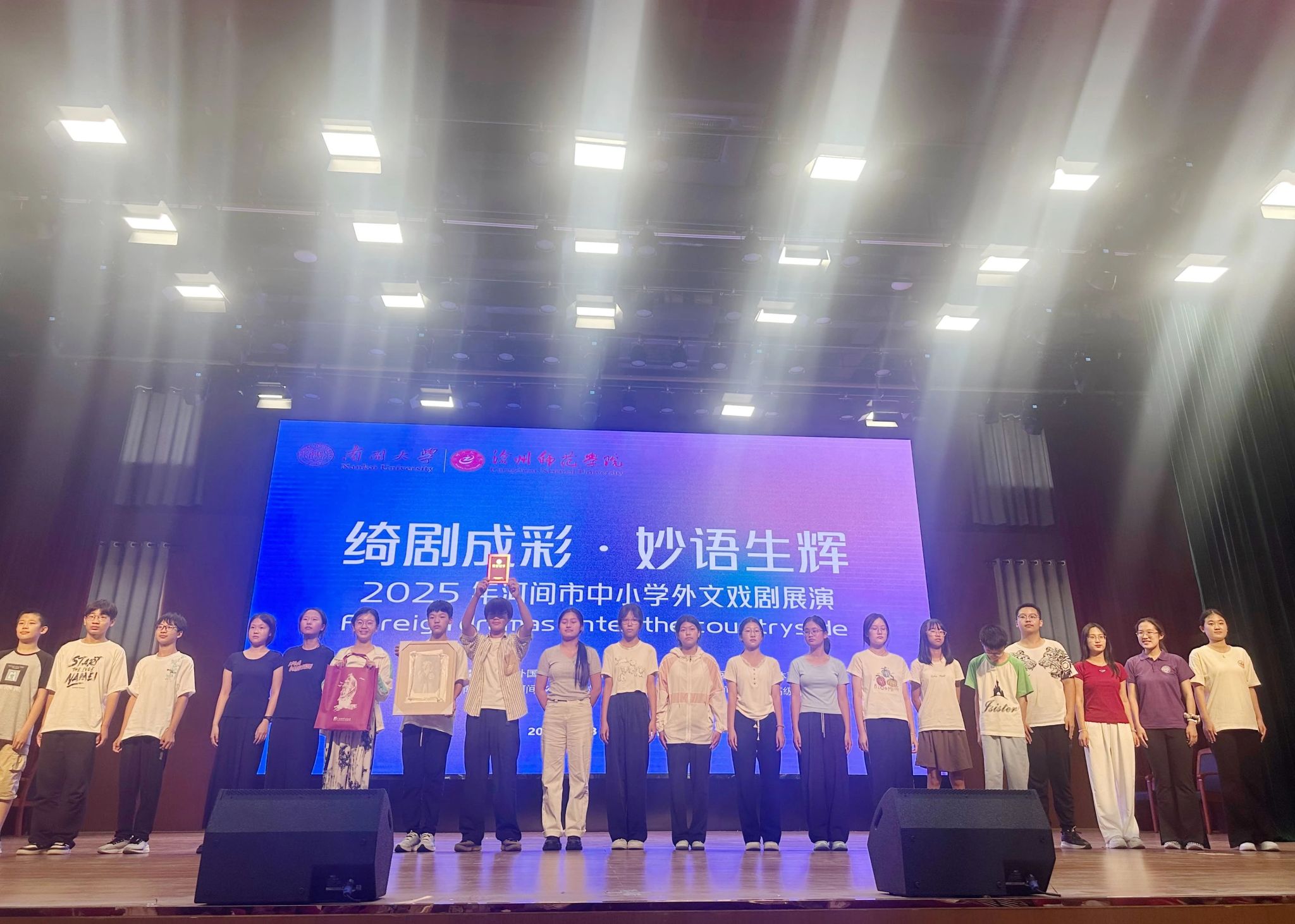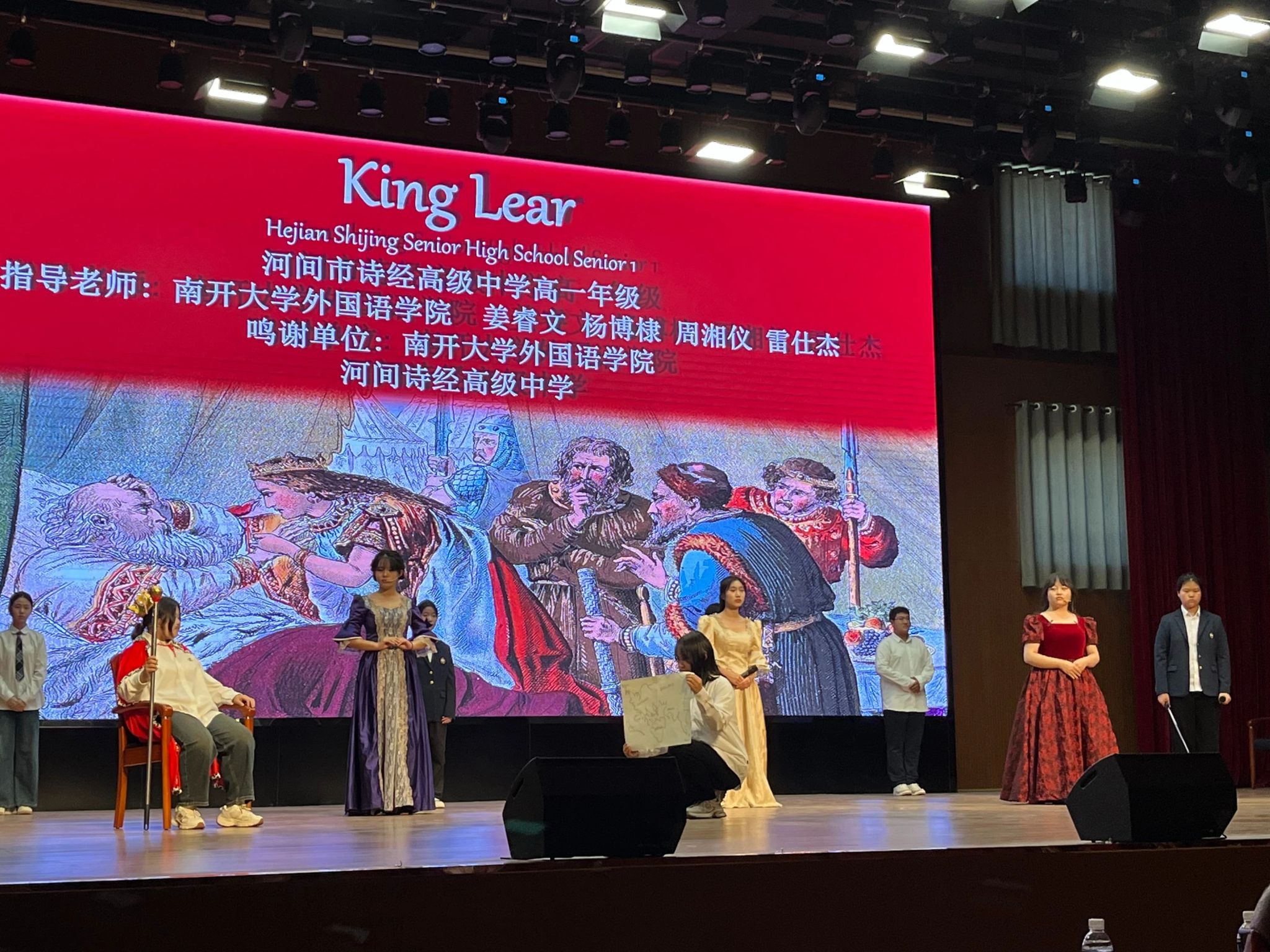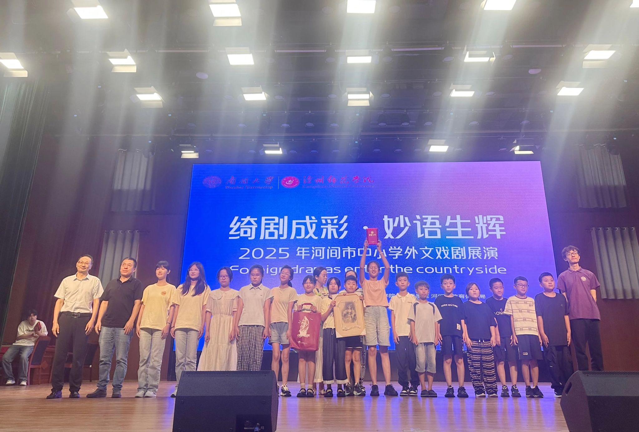 南开大学河间乡村工作站校友站长蔡印同和河间市副市长张子良为师生志愿者颁发“荣誉村民”证书,感谢两校师生为乡村外语教育播撒的星光。 “外文戏剧进乡村”是南开大学发扬外国语学院外文剧社的优良传统,积极响应乡村振兴和“一带一路”倡议,依托南开大学河间乡村工作站和教育部教学科研一体化外语教学研究虚拟教研室,发起的社会实践公益项目。自2025年寒假启动之初,外国语学院院长王娜、副院长徐广林就组建优秀师生团队全面参与其中。寒假前夕,志愿者们进行了一个多月的线上活动,开展剧本编译、讲解戏剧知识、发音示范纠正等工作。寒假期间,志愿者们赴河间各地进行面对面指导和实验演出。暑期期间,两校师生志愿者深入河间诗经高级中学、河间十四中、八里庄小学、米各庄一中、北老生中学、北司徒小学等10所中小学,开展了两周的线上教学和两周的现场排练指导工作。从“怯于开口”到“自信演绎”,从“机械跟读”到“情感表达”……河间的村里娃在大学生志愿者们的耐心指导下,演绎出了《哈姆雷特》《花木兰》《愚公移山》《李尔王》《音乐之声》等一幕幕精彩戏剧。