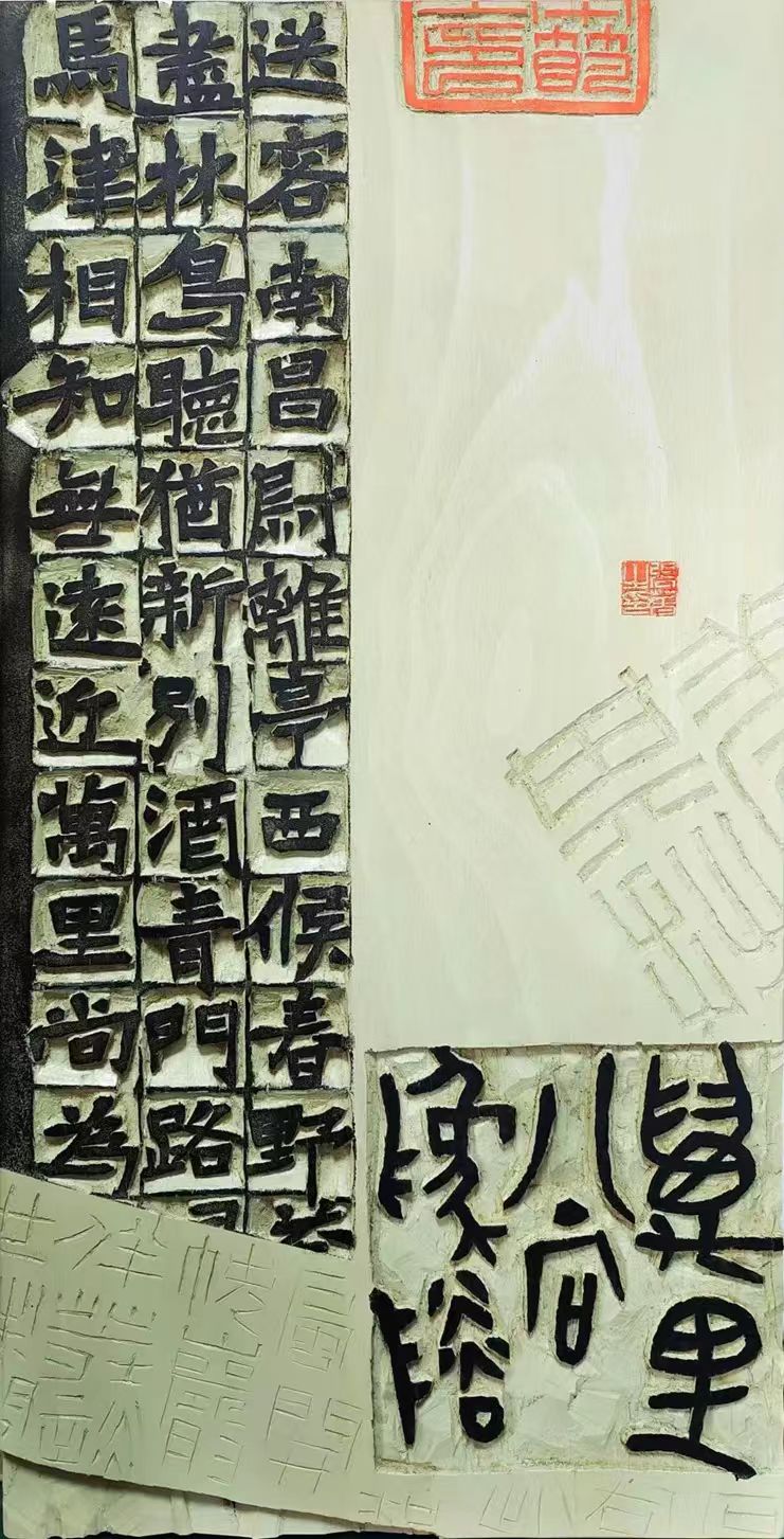 承蒙院长和领导支持,张之先生受邀来教授木板刻字。这对我来说是十分新鲜的事。在为期三个月的学习中,张之先生带我们从写小稿、定木材开始,一步步创作。晓霞老师、田老师和于老师也为我们提供灵感。本着发挥自己优势的原则,从金石拓片中汲取灵感,创作了玺印主题木板作品。在制作过程中运用光影关系,力求板面干净利落又有对比。无论是调色上板还是手工雕刻,张老师都寸步不离,给了我们极大的安全感。最终,我有幸在河北省书协刻字展中入展,得到了更多关注与认可,感激之情,溢于言表。