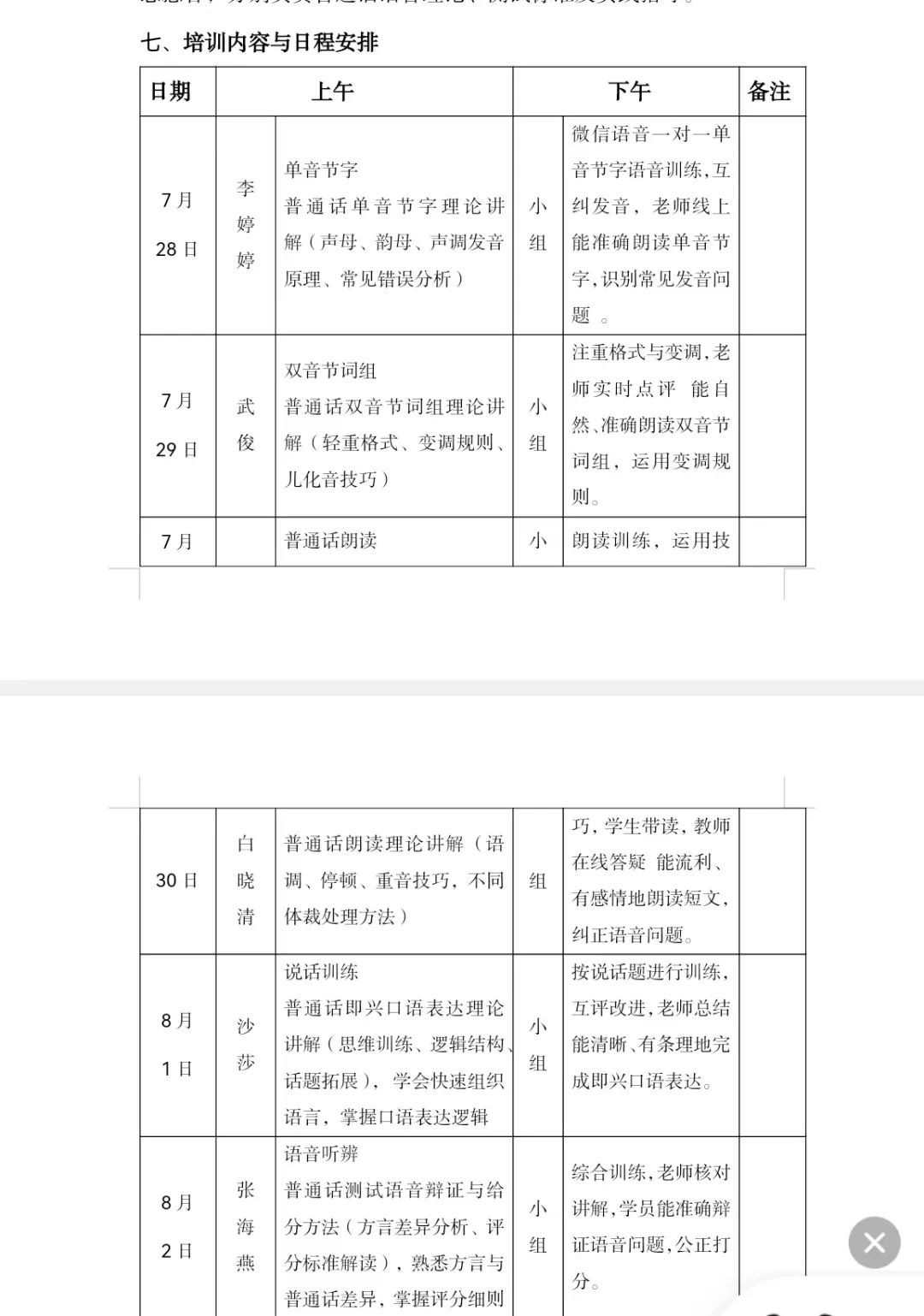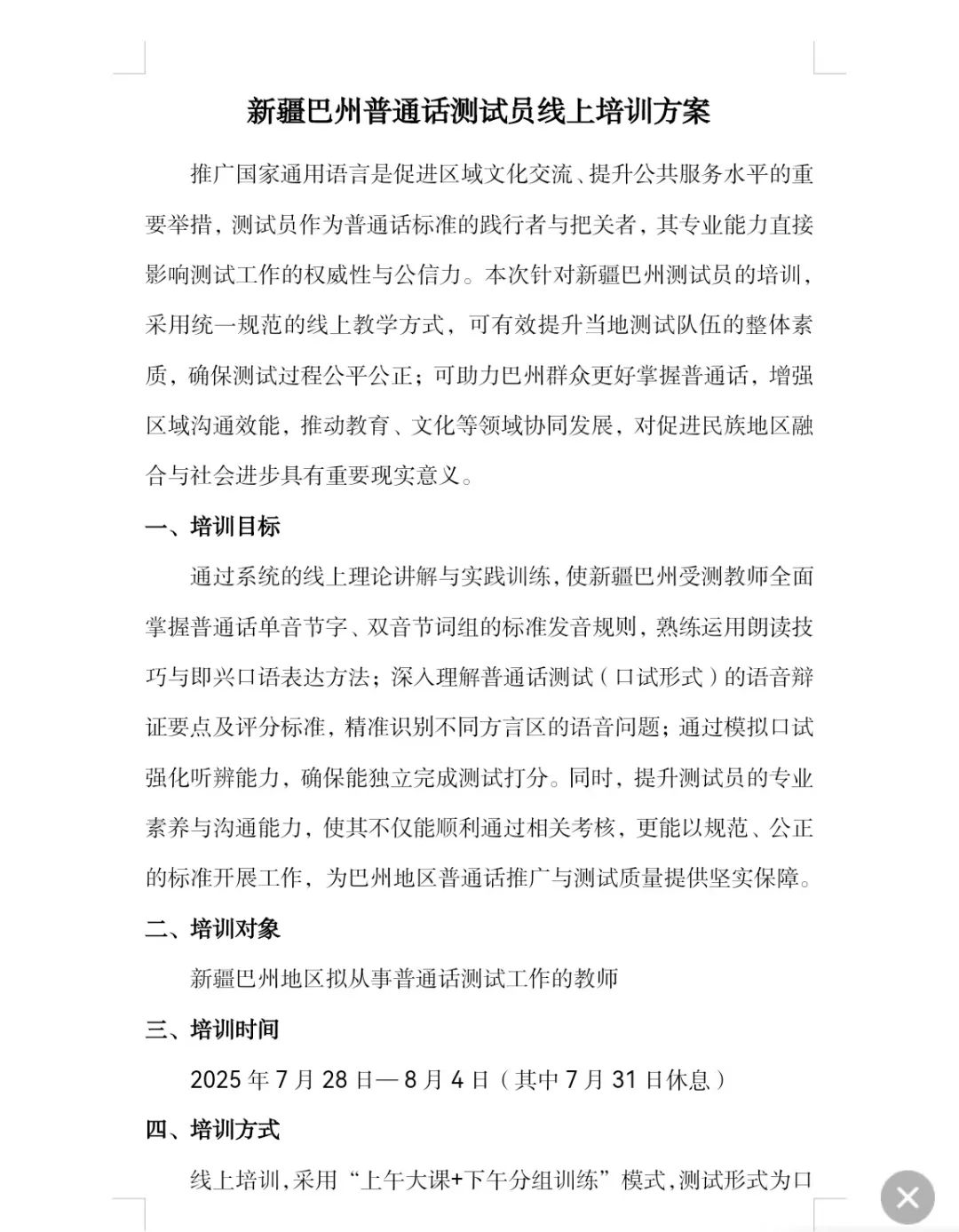 培训团队负责人张海燕教授结合巴州方言特点与岗位需求,制定了详细方案,明确三大核心目标,致力于提升学员语音技能和测试打分能力,为巴州普通话推广建立长效机制。同时,针对线上培训特点,设计了“上午大课 + 下午分组训练”的混合式教学模式,确保学员能系统学习理论知识并获得个性化指导。