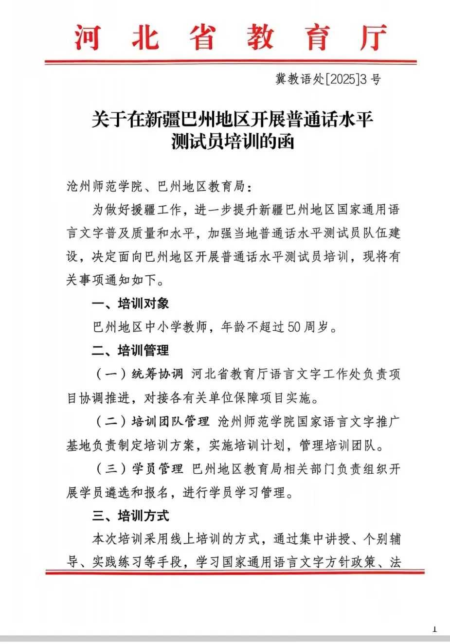 在河北省教育厅、河北省语言文字处的悉心指导下,太阳集团tcy8722网站国家语言文字推广基地于7月28日至8月4日,成功为新疆巴州地区开展了普通话水平测试员线上培训。此次培训旨在提升巴州地区普通话测试员专业素养,夯实国家通用语言文字推广基础,为促进民族融合、铸牢中华民族共同体意识注入了强劲动力。
