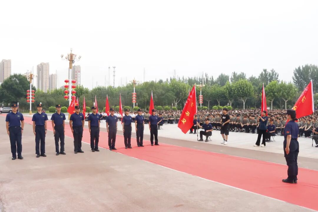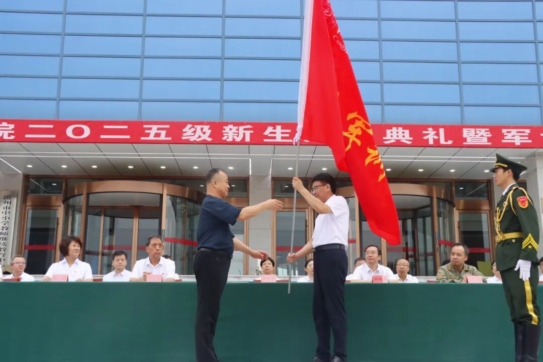 党委书记、军训领导小组组长云电军同志为军训团团长辛智广同志授军训团团旗。飘扬的旗帜在阳光下格外鲜艳,象征着师院精神的赓续与勇担时代重任的使命代代相传。