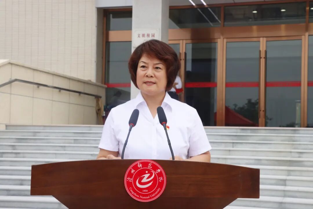 党委常委、副校长郭玉秀主持典礼。她勉励同学们,要谨记“明德 博学 知行 日新”的校训,践行“孜孜以求、团结奉献、精益求精、敢于胜利”的师院精神,珍惜韶华,刻苦学习,勤于实践,勇于创新,努力成为不负国家和民族期望的新时代筑梦人。