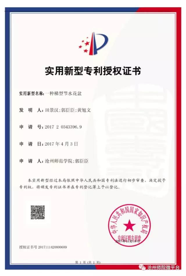 近日,由生命科学学院教授田景汉,2014级生物技术专业郭臣臣、黄旭文申请的“一种梯型节水花盆”得到授权,获得国家专利。
