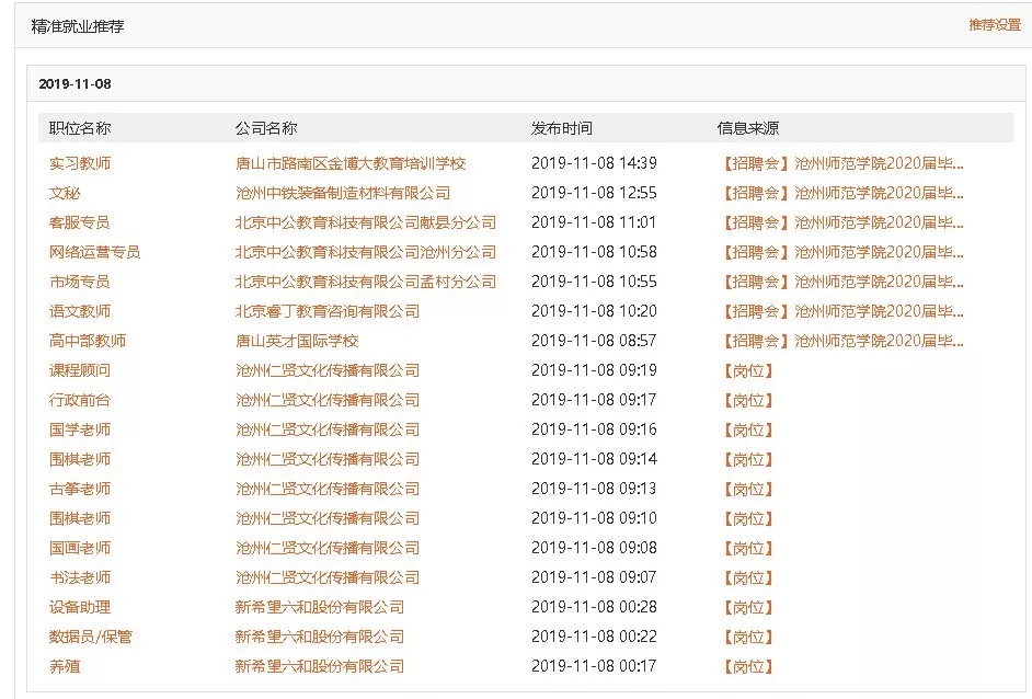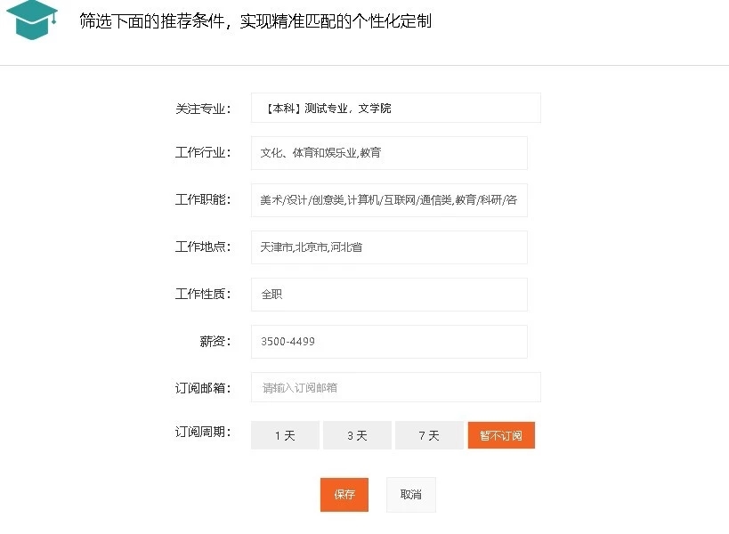 点击模块右上角的“推荐设置”,选择完善关注专业、工作行业、职能等信息即可进行定制。如果填写订阅邮箱及周期,岗位信息会即时发送到邮箱,可以更加快速地了解就业信息,及时抓住应聘好机会!
