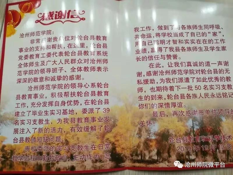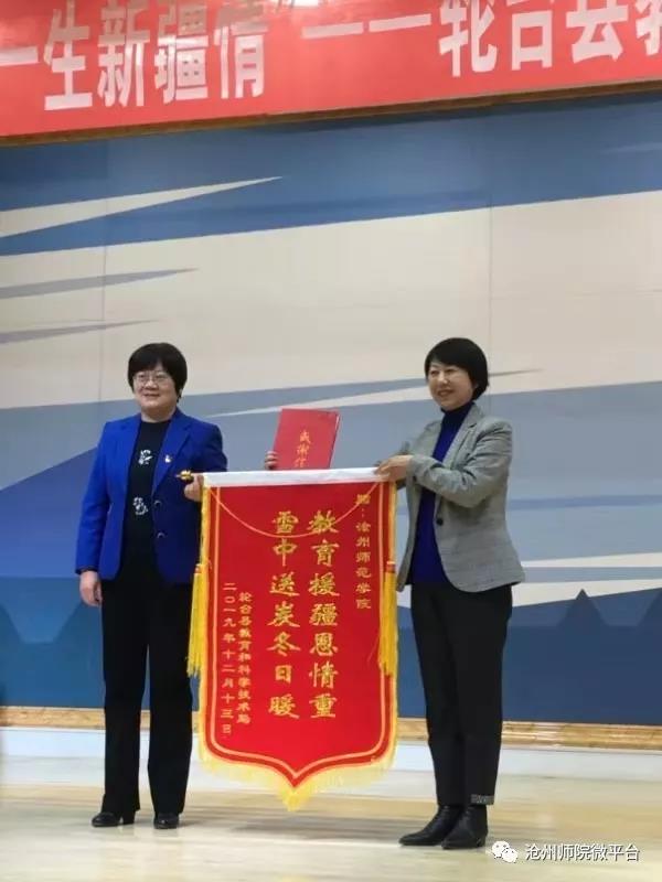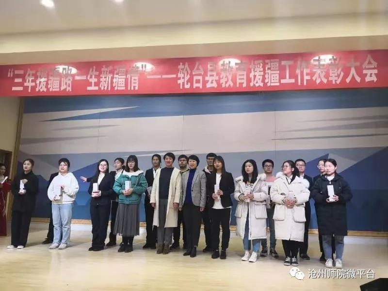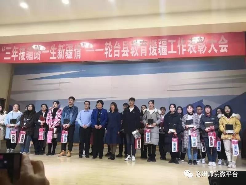12月13日,轮台县教科局在轮台县青少年活动中心举行了盛大的教育援疆工作表彰大会。轮台县党委副书记、组织部长、县党委教育工委书记刘泽彬,轮台县党委副书记、沧州援疆工作前方指挥部指挥长张景俭,轮台县人民政府副县长金彩霞,沧州援疆管理办公室主任刘碧佳出席会议。太阳集团援疆支教团带队老师赵林静带领39名支教实习生参加了表彰大会,并获得多项荣誉表彰。