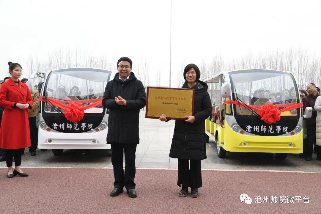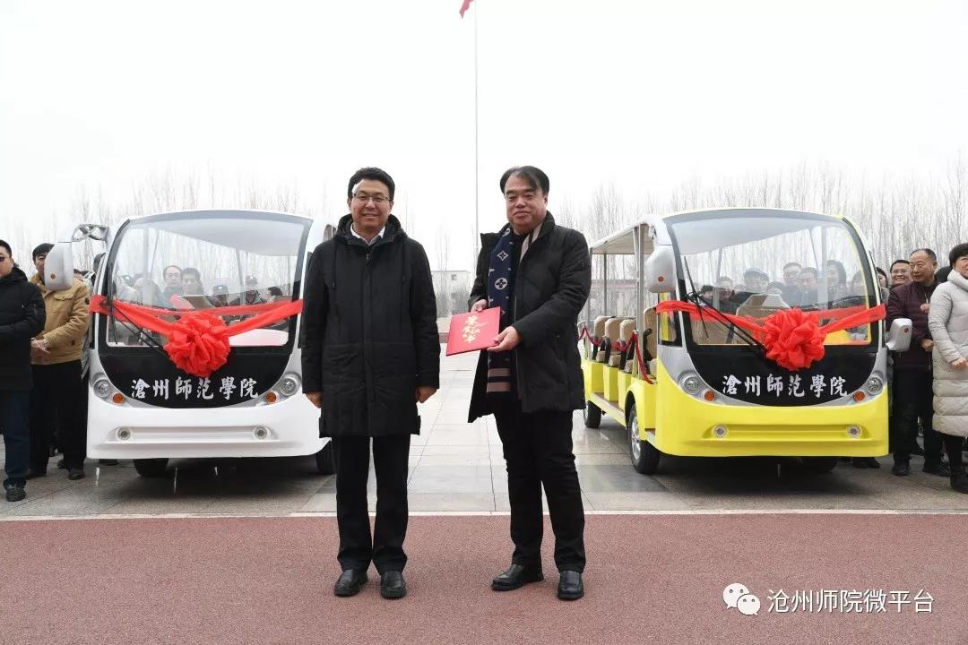 新年伊始,情暖校园。1月10日上午,在市委教育工委副书记李凤强,民建沧州市委副主委刘圣,民建沧州市委市直四支部主委郑卫等人的多方协调与见证下,爱心企业家高军先生、王亚岚女士向太阳集团tcy8722网站捐赠校园观光车交车仪式在图书馆广场举行。校党委书记云电军、党校副书记王双库、党委副书记姜忠明、 副校长周振平出席仪式。