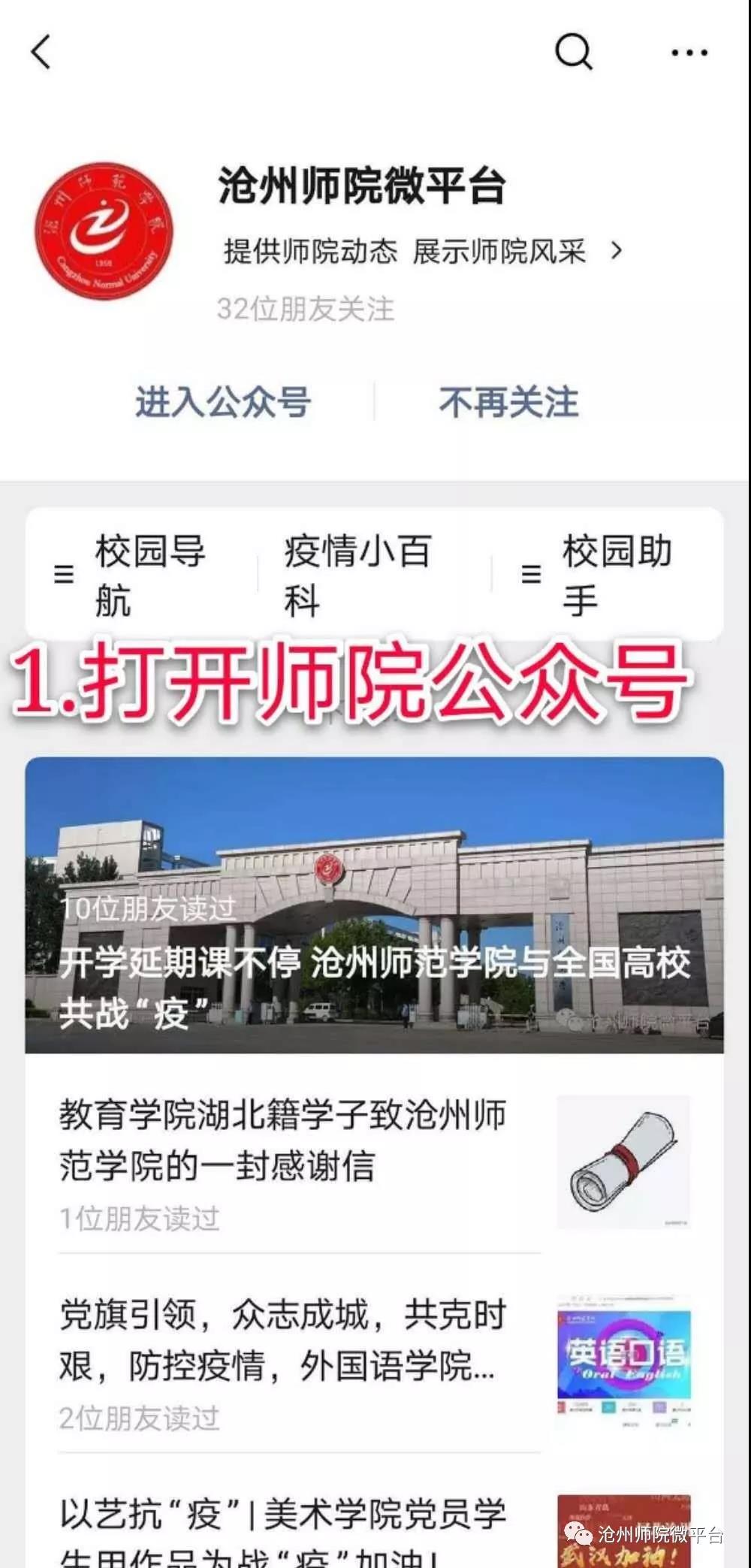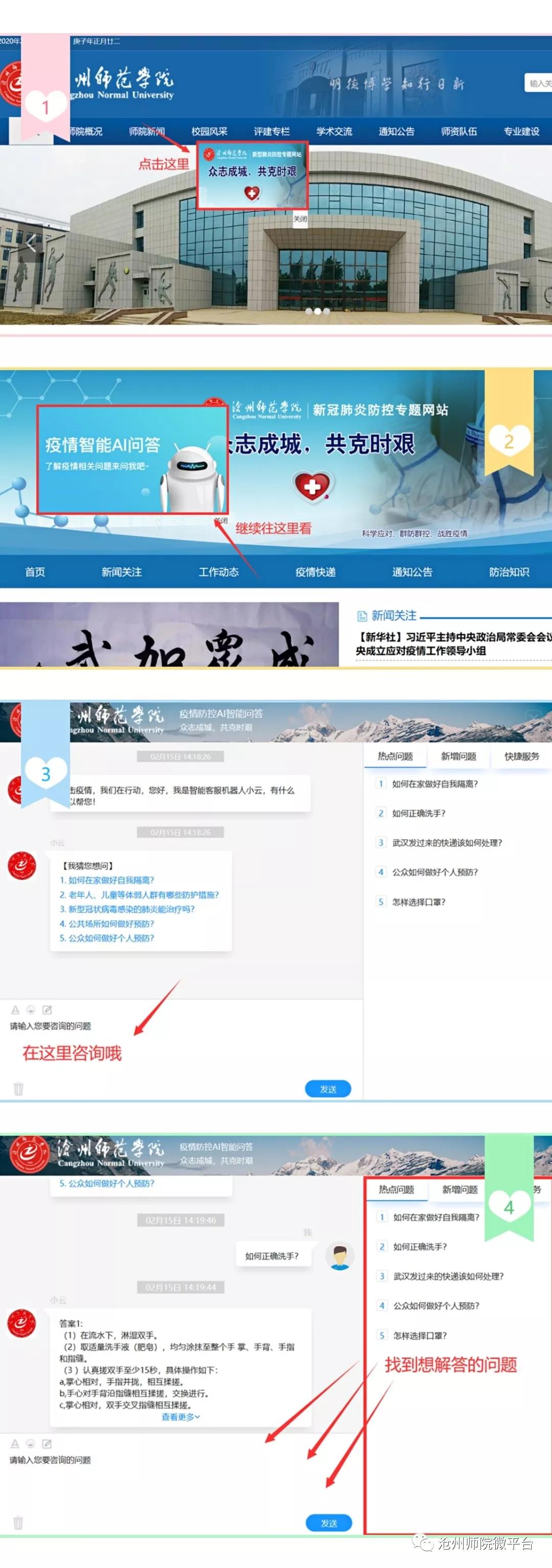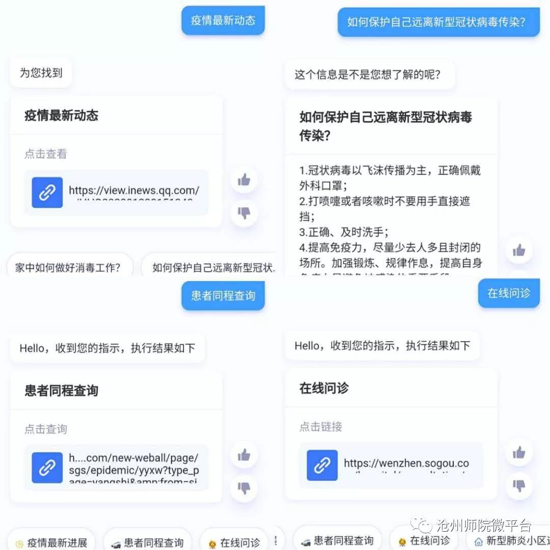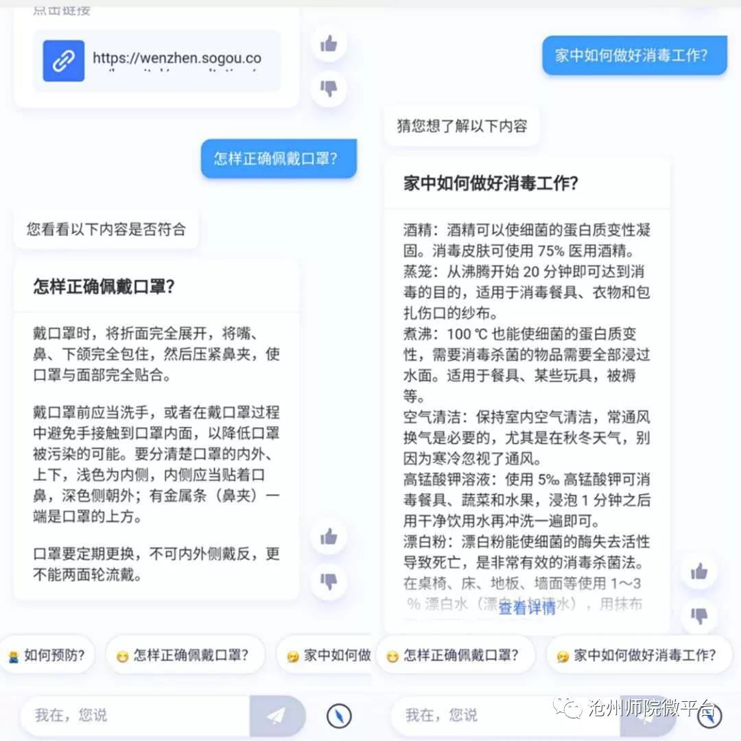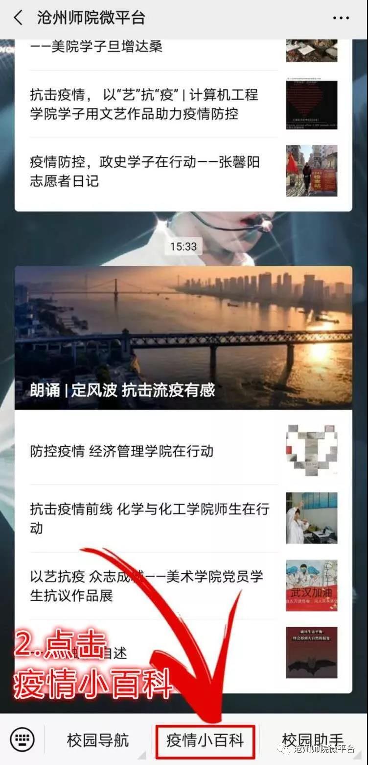 公众号搜索:打开沧州师院微平台,点击页面下方的“疫情小百科”,在对话框中输入你想要咨询的问题即可。如果页面有你想要问的问题,只需要点击就可以出现答案了!