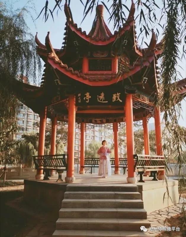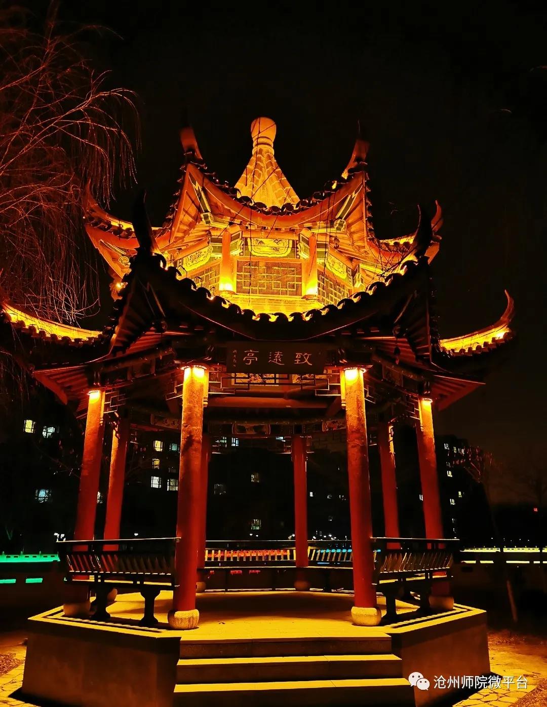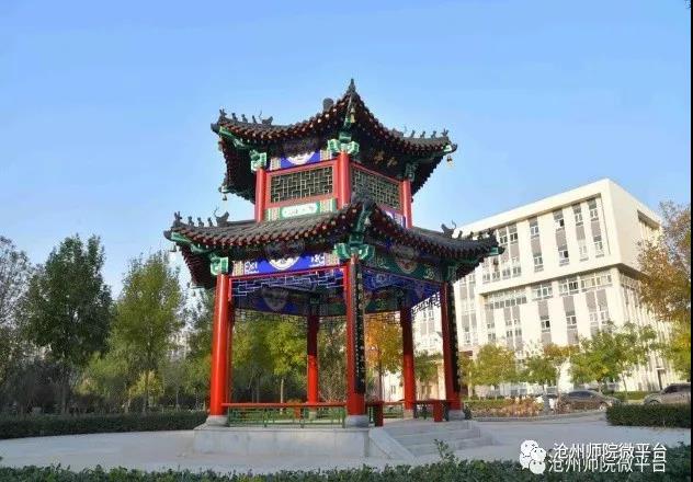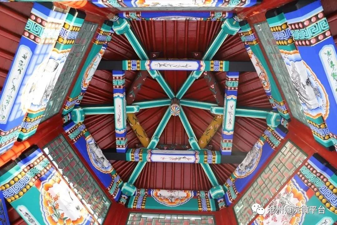 和亭:现为沧州最大的榫卯结构的木质六角亭。木件之间多与少、高与低、长与短巧妙组合,精雕细琢,环环相扣,层层叠加,达到"天衣无缝",它屹立学校中轴线,成为师院最美的一道风景线。