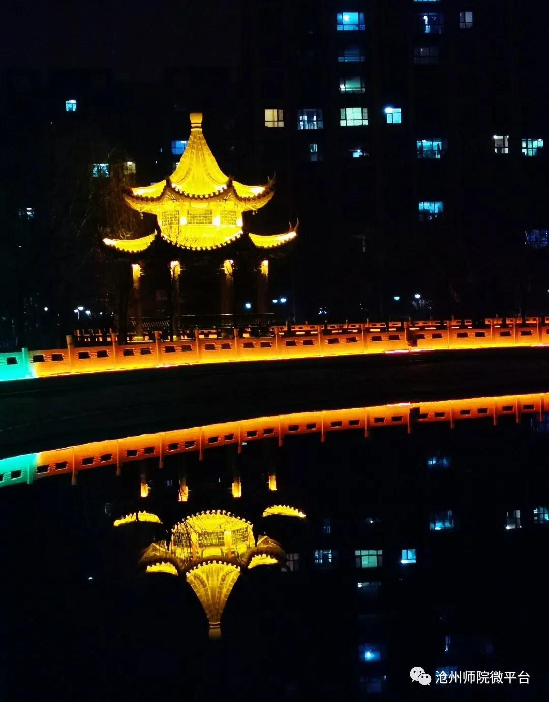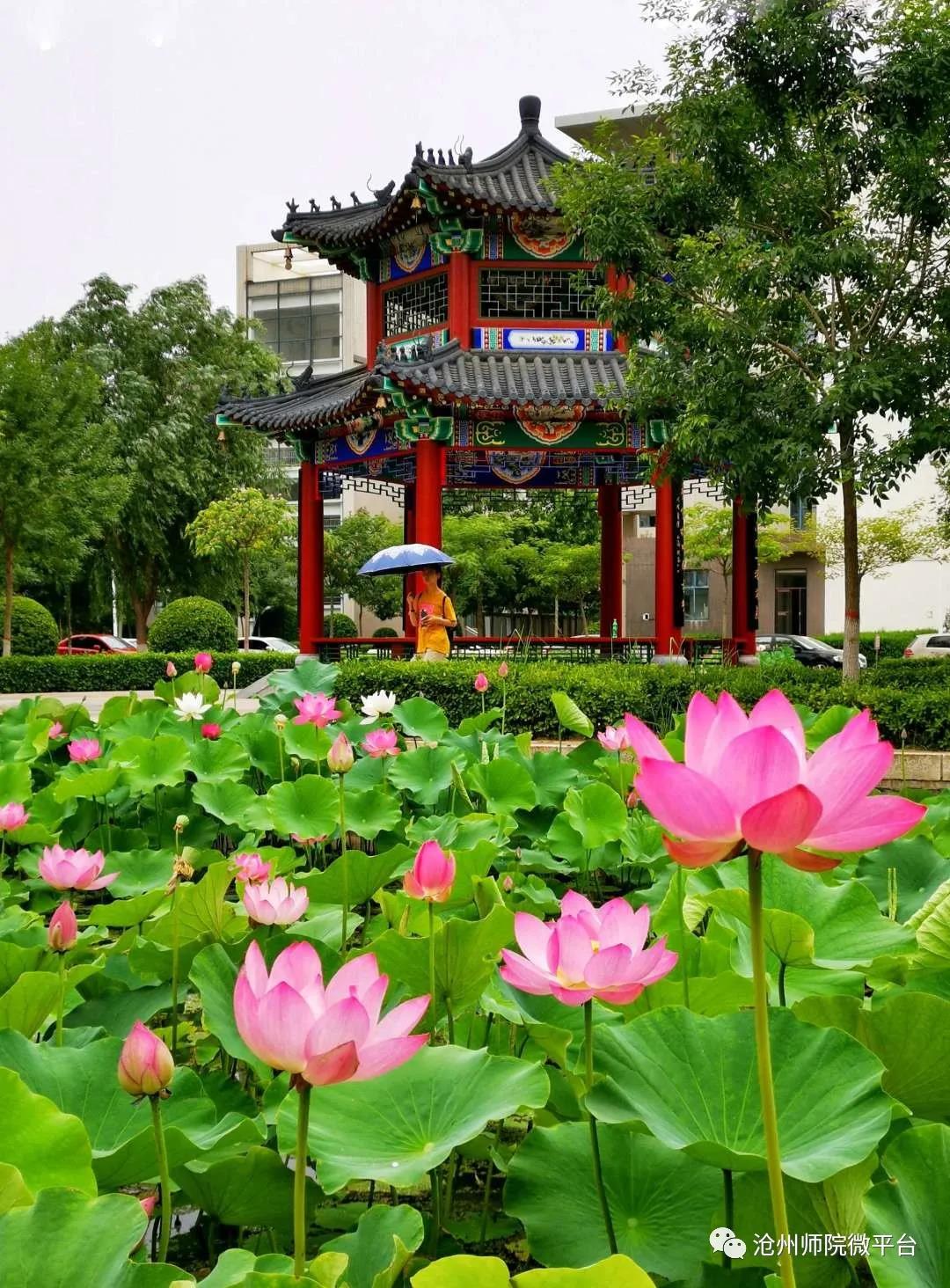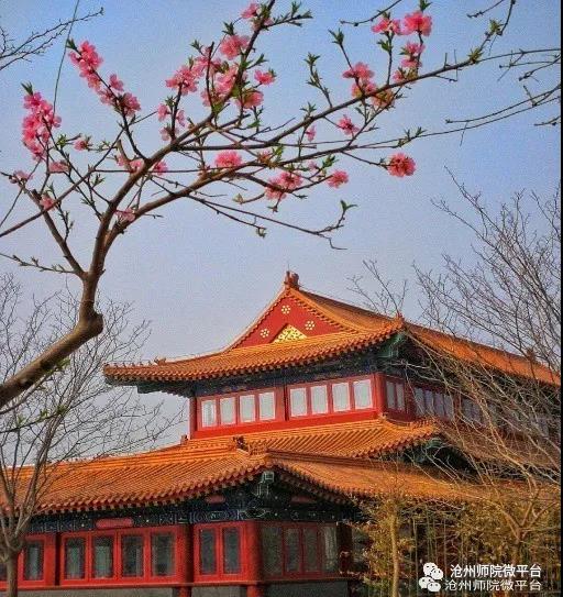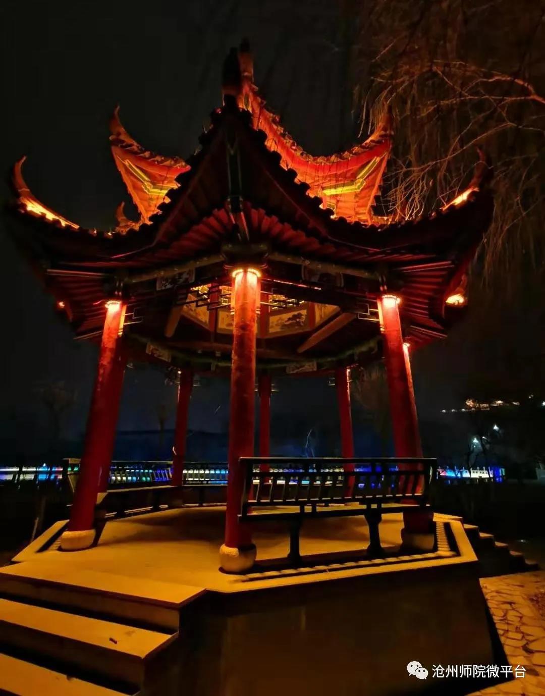 和亭:现为沧州最大的榫卯结构的木质六角亭。木件之间多与少、高与低、长与短巧妙组合,精雕细琢,环环相扣,层层叠加,达到"天衣无缝",它屹立学校中轴线,成为师院最美的一道风景线。