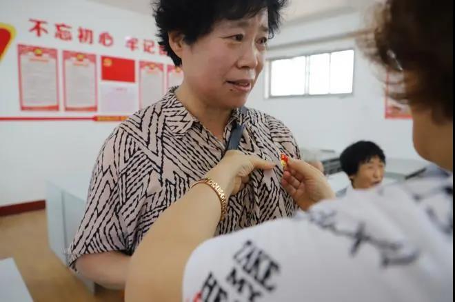 在支部会议正式开始前,老党员们一遍遍地整理着服装,仔细检查着党徽的佩戴,话语间和笑容里满满都是对幸福生活的满足和对为党庆生活动的期待。
