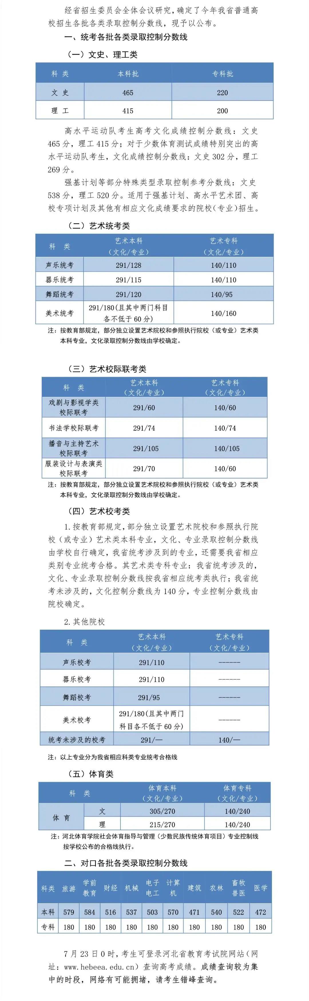 【发布】2020年河北省普通高校招生各批各类录取控制分数线