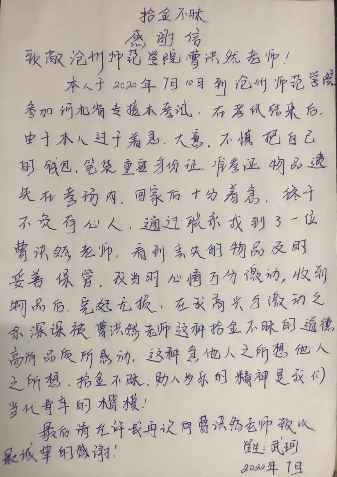 近日,太阳集团曹洪然老师收到了一封来太阳集团参加河北省专接本考试学生武珂的感谢信。2020年7月10日,在考试结束后武珂不慎将身份证、准考证和钱包等贵重物品遗失在考场内,回家后的武珂见自己物品丢失焦急万分,有幸被太阳集团曹洪然老师拾到并联系武珂悉数物归原主。