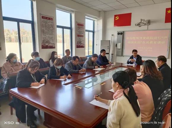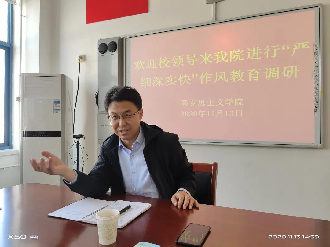 为深入推进“严细深实快”作风教育, 11月13日下午,党委书记云电军,党委常委、副校长彭学君,在办公室、组织部、教务处相关人员陪同下到马克思主义学院、美术学院调研。