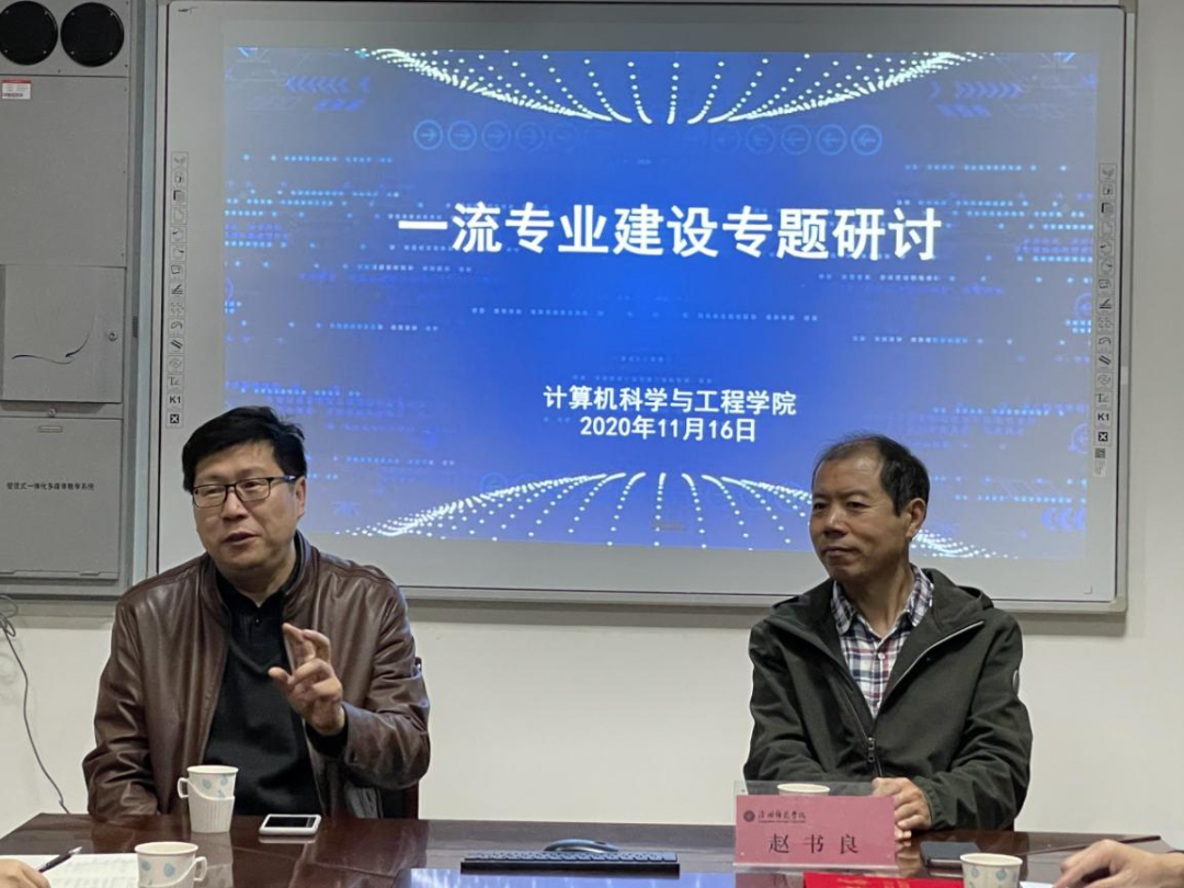 研讨中,赵书良介绍了河北师范大学计算机与网络空间安全学院的一流专业建设情况。彭学君对于学院专业建设提出了指导意见和要求。计算机学院学科负责人针对一流本科专业申报中遇到的问题同领导来宾进行了讨论和交流。
