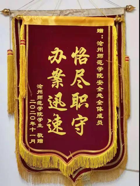 疫情期间,按照学校疫情防控要求,安全工作处全体人员坚守一线,严格值守,无休无退,为学校的疫情防控作出贡献。开学以来,处理大小安全事件20余起,无论是查找丢失物品、处理损坏公物还是制止非法出入校园、处理安全隐患……全体人员认真对待每一件细事、小事,严格细致地开展调查工作,尽快地解决和处理好问题,将损失降到最小化,保护了师生的生命财产安全,受到了师生的好评,涌现出了多个爱心捐款、恪尽职守、见义勇为的典型。正如学院赠送的锦旗上所说的:办案迅速,恪尽职守;心系学子,担当奉献。