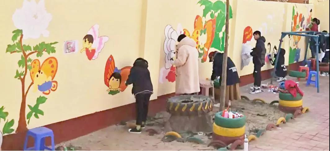 团队充分发挥党员、积极分子带头作用,发挥师生专业能力,利用课余时间将师生专业能力与公益活动相结合,为需要墙绘任务的村庄、幼儿园等开展