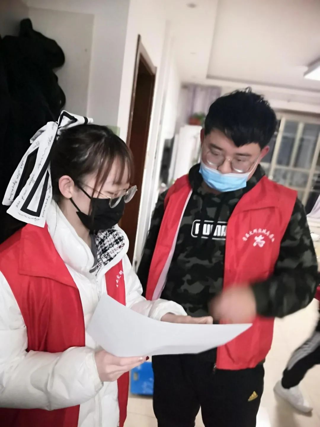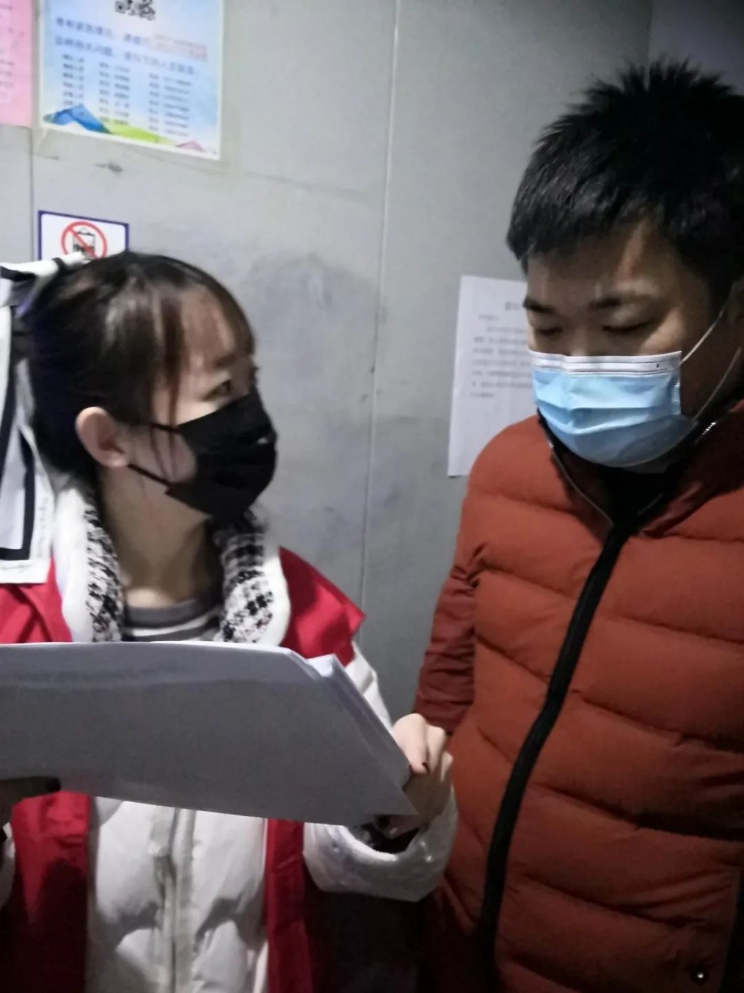 在服务过程中,迎接她的有温暖的笑脸,也有悄寂无声。在三号楼里她遇到了她的第一个队友胖尹,他披上外套,马上进入了工作状态。他们交流如何填写表格,如何与住户沟通。多了一个人的帮助,任务完成率得到了显著的提升。第二天小范同学也加入进来,他们三个分成两组,对四号楼发起“攻击”。风又硬又冷,羽绒服一下子就被冷风钻透了,她抱着表格一路小跑进了四号楼,把表格的填写方法和注意事项交代了一遍又一遍……