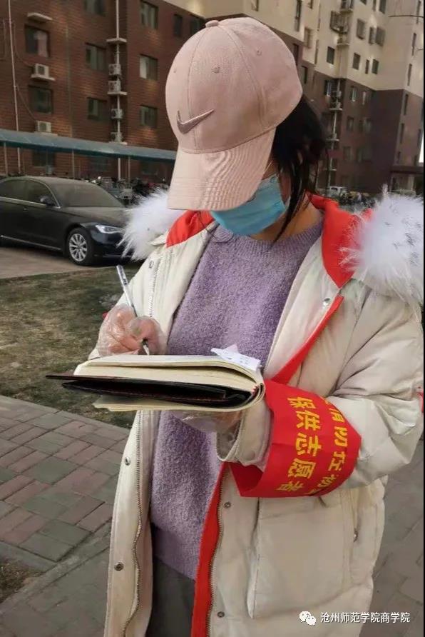 商学院20级国际商务高心怡,在河北省石家庄市平山县西城华府社区中进行志愿服务,任务是门岗值班、分配物资、挨家挨户的上门登记信息。