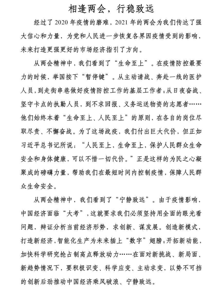 兴酣落笔摇五岳,诗成笑傲凌沧洲。五年制学生结合史事与社会发展,用文字汇成篇章,书写着他们在党史教育中领悟到的新思想、新启发,表达了对美好未来的无限畅想。