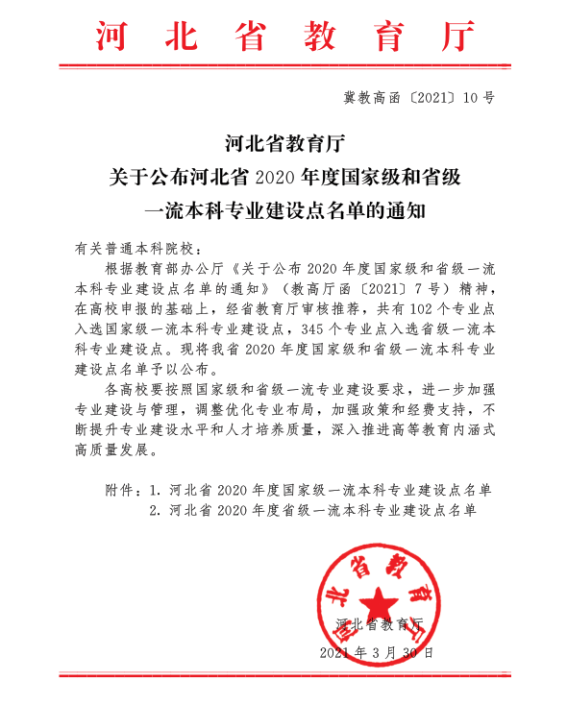 根据教育部办公厅《关于公布2020年度国家级和省级一流本科专业建设点名单的通知(教高厅函〔2021〕7号》精神,河北省教育厅于近日下发《河北省教育厅关于公布河北省2020年度国家级和省级一流本科专业建设点名单的通知》(冀教高函〔2021〕10号),太阳集团思想政治教育、电气工程及其自动化、美术学三个本科专业获批2020年度省级一流专业建设点。