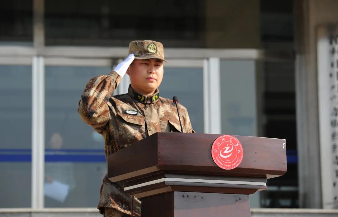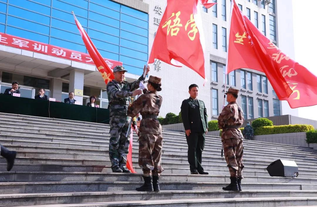 大会在嘹亮的国歌声中拉开帷幕,党委书记、军训领导小组组长云电军同志为军训团授旗,校长张占平发布军训动员令。