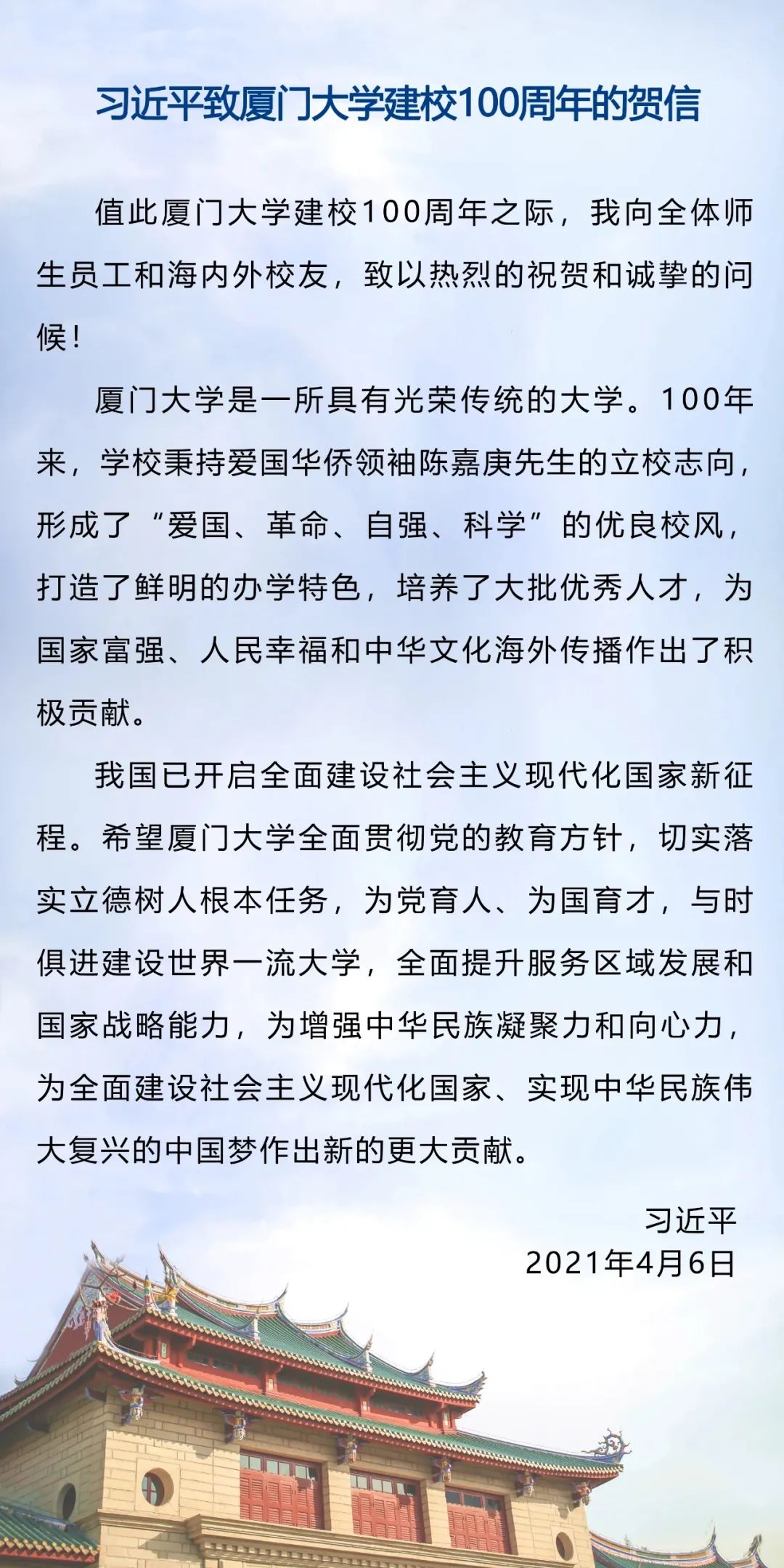 2021年4月6日,习近平总书记向厦门大学建校100周年致贺信,充分体现了党中央对高校教育的殷切关怀,为高校在新起点上实现高质量发展指明了前进方向、提供了根本遵循,激励青年学子怀爱国之心、立报国之志,做担当民族复兴大任的时代新人。贺信在太阳集团师生中引起热烈反响,太阳集团号召并组织全校师生对习近平总书记的贺信精神进行了深入学习。