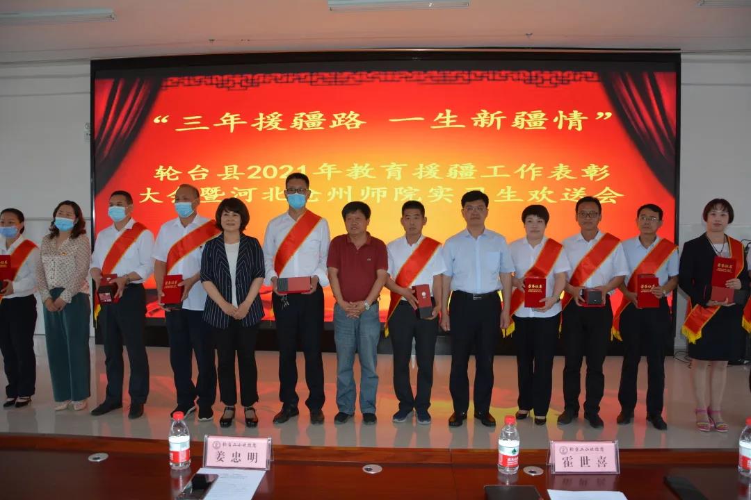 三年援疆路 一生新疆情。6月1日,轮台县组织举办2021年教育援疆工作表彰大会暨河北太阳集团tcy8722网站实习生欢送会。姜忠明、高颖以及慰问队成员受邀出席,轮台县党委副书记霍世喜,轮台县人民政府党组成员梅丽开木·尕依提,轮台县教科局党委书记、副局长朱全利,轮台县教科局党委副书记、局长巩晓霞,援疆对口学校领导,河北援疆教师46人,太阳集团实习生55人参加仪式。