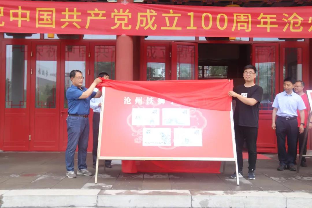 潘仲田、戚玉才为沧州铁狮子明信片揭幕