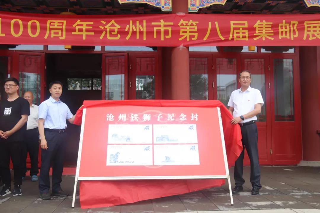 谢云岭、赵毅、潘仲田、戚玉才分别为沧州铁狮子纪念封、明信片揭幕。