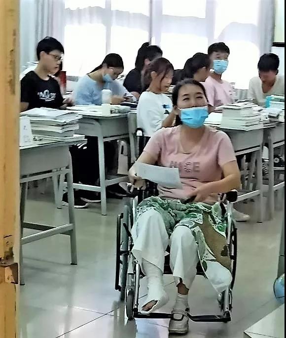 刘曦老师是2018级五年一贯制公费师范生小学教育专业三、四班的辅导员,也是全年级四个班的地理老师。去年暑假,临近开学的日子,正在休产假的刘曦老师不慎从楼梯跌落,导致右脚严重骨折,突发的意外打乱了已安排好的开学上课计划。受伤前一天,刘曦刚刚承担下全学院的地理课教学任务,也满怀期待地见到她那些可爱的孩子们。想到学院里仅有她一名地理老师,想到五年一贯制孩子们马上要面临升大学、实习等重要任务。刘曦毅然决然地坐上轮椅,重返工作岗位。