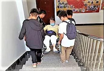 在教育学院的楼梯长廊上,经常能看到这样一幅感人的画面:“一位脚打石膏的年轻女教师咬牙坐在轮椅上,四五个学生合力将她一节节抬上去……”路过的师生都会主动避让,被这样一幅场景深深打动……