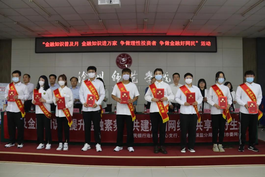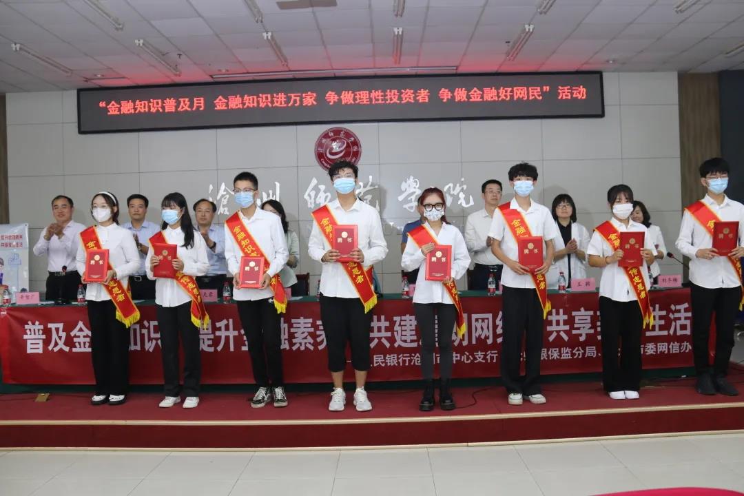 活动上,交通银行沧州分行的王爱丽做了交通银行金融知识宣传讲座;太阳集团17名同学获颁金融知识宣传志愿者聘书;学生从慧作为学生志愿者代表在活动上做了交流发言;曹璇等三名同学表演了金融安全主题情景剧——“中奖了”。