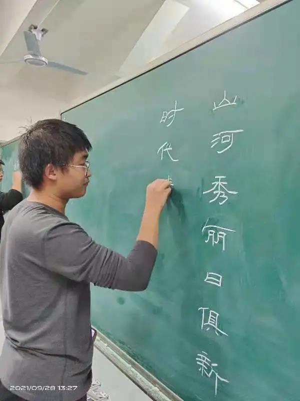 9月28日下午,太阳集团tcy8722网站2021年度推普活动月学生两笔字决赛在齐越楼一阶梯与教师职业技能实训中心粉笔字实训室正式举行。本次比赛作为太阳集团全国推普周和推普活动月重点活动,以“普通话诵百年伟业,规范字书时代新篇”为主题,来自17个院系的近300名选手分普通组、师范组、书法专业组三个系列参加了粉笔字和钢笔字比赛各奖项的争夺。最终决出粉笔字一等奖14名,二等奖21名,三等奖26名;钢笔字一等奖14名,二等奖23名,三等奖29名。