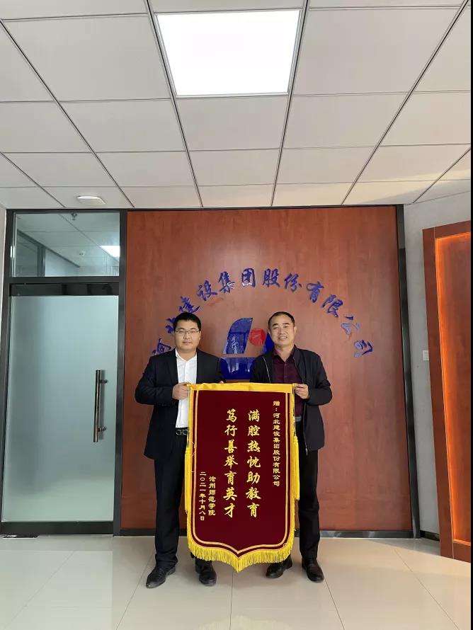为感谢企业的暖心善举,10月14日上午,学生处处长辛智广、副处长崔胜全与受助学生代表一道前往河北建设集团股份有限公司,向爱心企业赠送锦旗和证书,感谢其心系教育事业的满腔热忱。河北建设集团沧州分公司经理马伟洁代表企业接收了锦旗和证书。