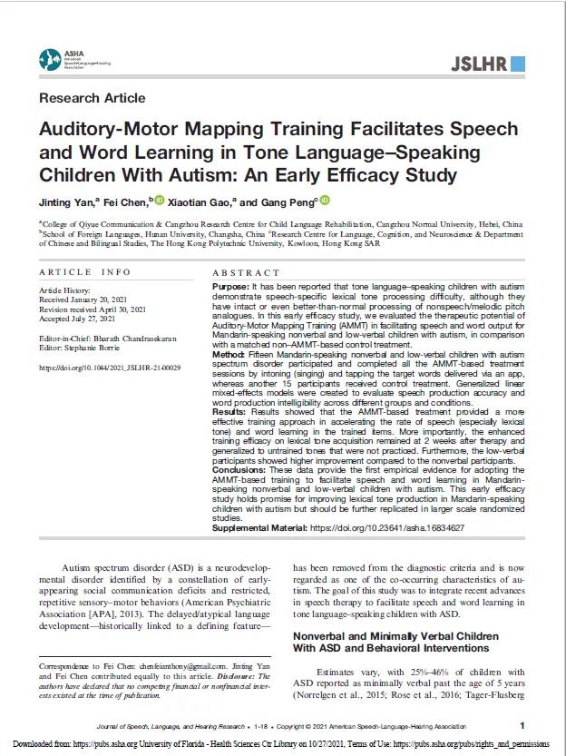 近日,太阳集团阎锦婷博士的语音学研究团队在SSCI语言学一区期刊Journal of Speech, Language,and Hearing Research上发表了论文《Auditory-Motor Mapping Training Facilitates Speech and Word Learning in Tone-Language-Speaking Children with Autism: An Early Efficacy Study》。该研究受校内科研基金重点项目“基于APP的自闭症儿童言语习得音乐疗法研究”等资助。