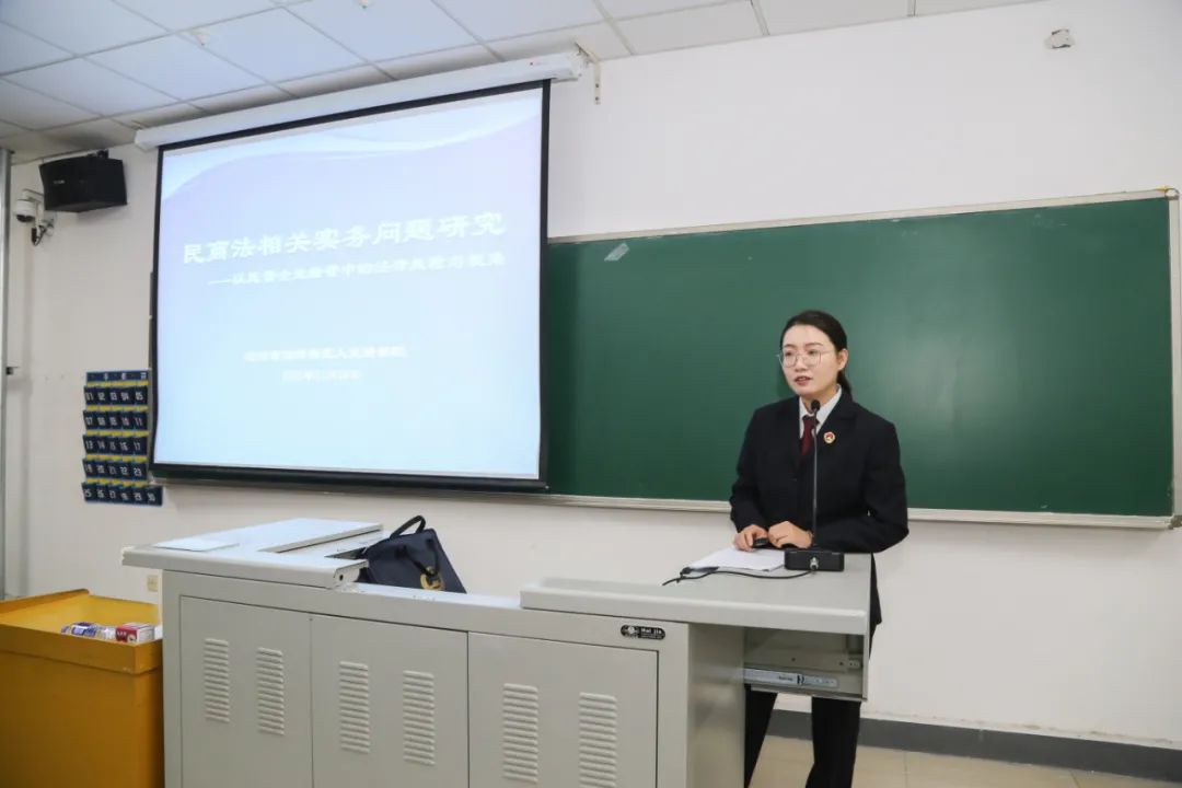 签约仪式结束后,沧州市渤海新区人民检察院检察官王丽娟围绕民营企业经营中的法律风险等法律实务问题为法学本科专业学生进行了专题讲座。