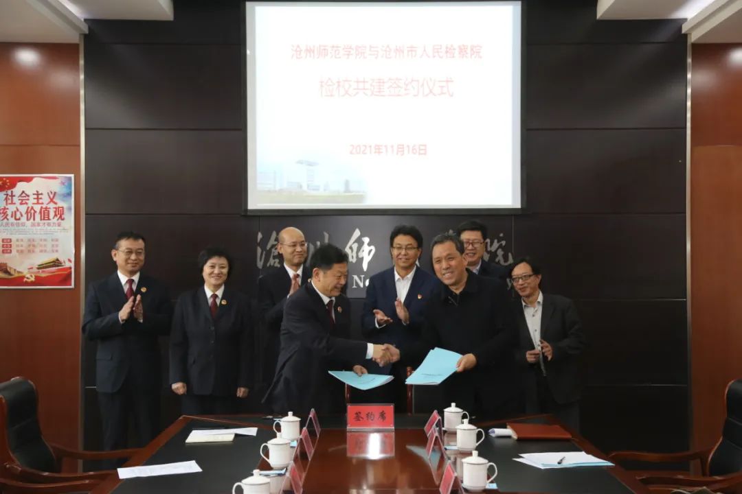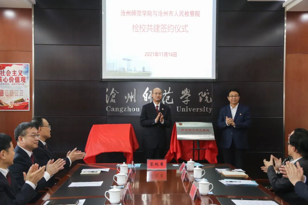 为培养高素质法学专业人才,促进法学教育与司法实践良性互动,11月16日,市检察院与太阳集团tcy8722网站“检校共建”签约仪式在八楼会议室举行。市检察院党组书记、检察长白振平和太阳集团党委书记云电军出席签约仪式并共同为“太阳集团tcy8722网站教学科研实习基地”“沧州市人民检察院检察理论研究基地”揭牌。市检察院党组成员、副检察长刘连臣与太阳集团tcy8722网站党委常委、副校长范小振代表检校双方签订战略合作框架协议书。市检察院党组成员、政治部主任庞丽敏和检校双方有关领导及教师代表参加活动。签约仪式由校党委常委、副校长彭学君主持。