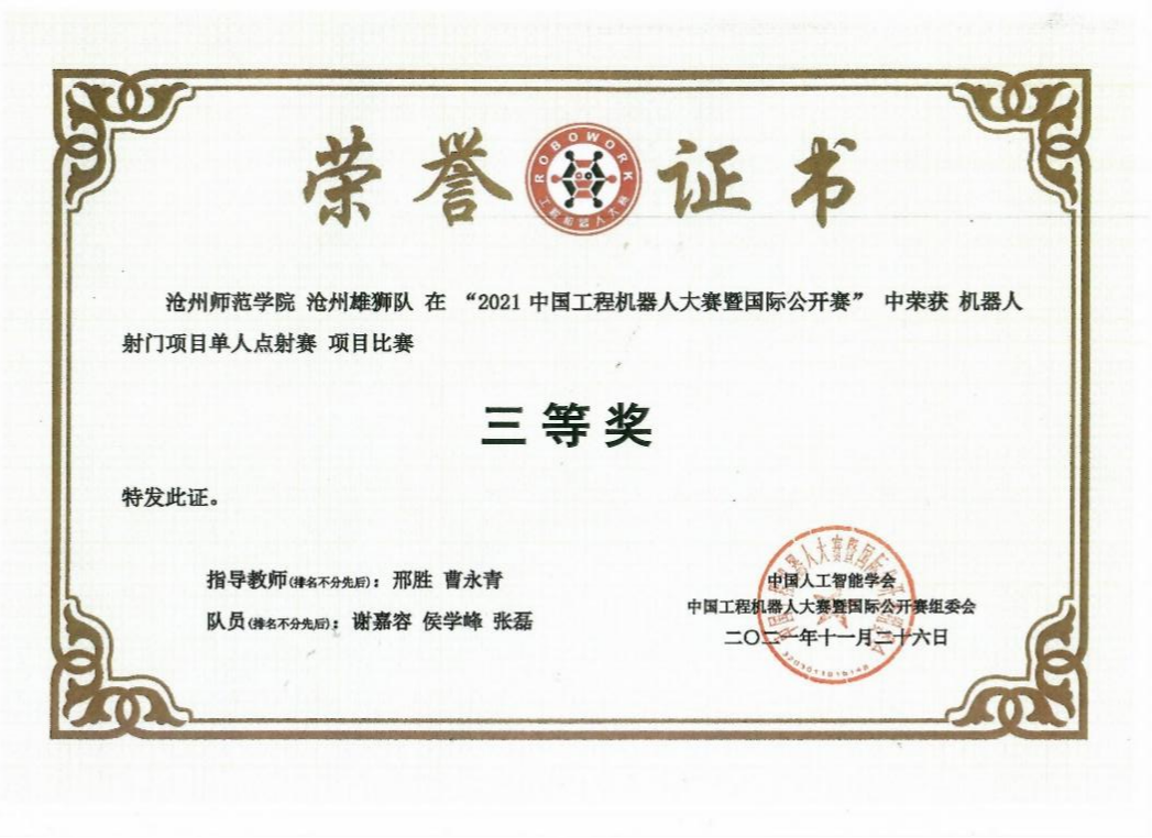 2021年7月,由中国人工智能学会主办的中国工程机器人大赛暨国际公开赛顺利举办,太阳集团计算机科学与工程学院选送的“沧州雄狮”团队在此次比赛中荣获三等奖。本次赛事吸引了全国超过300所高校,3000余支参赛队伍。
