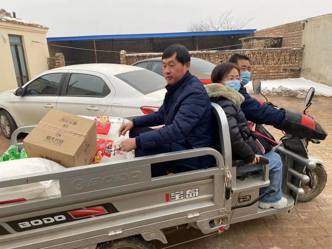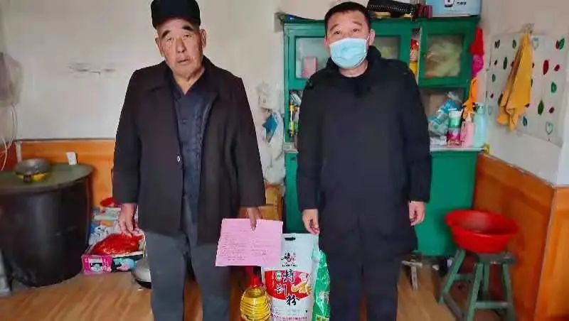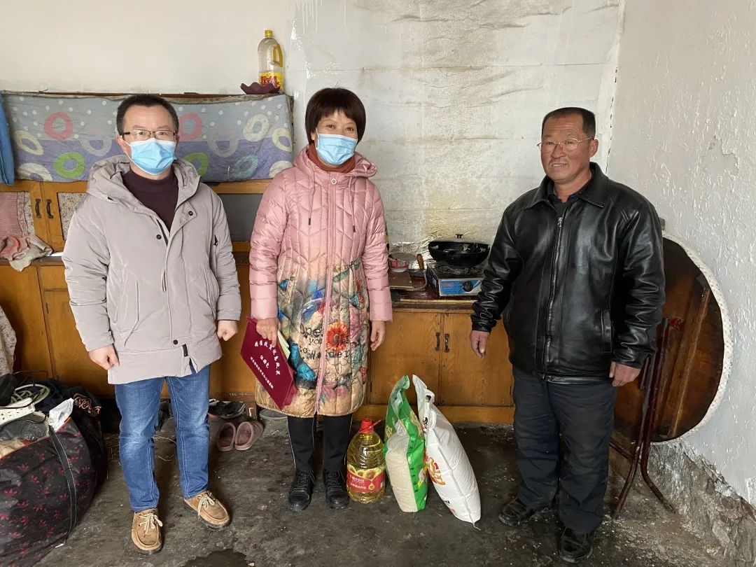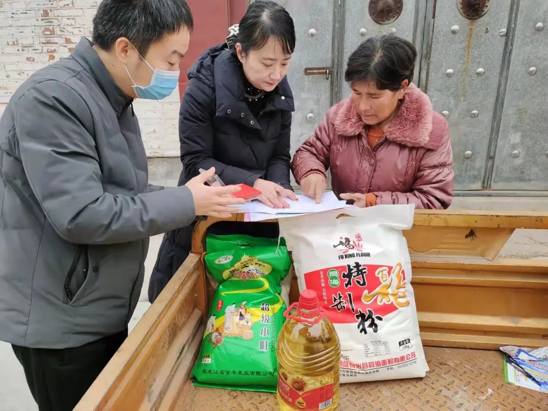 1月25日,新春佳节来临之际,太阳集团驻孟村县牛进庄乡东赵河村工作队和学校帮扶责任人入户走访,为帮扶群众送上食用油、面粉、大米等生活物资,也带去了党的关怀和问候。