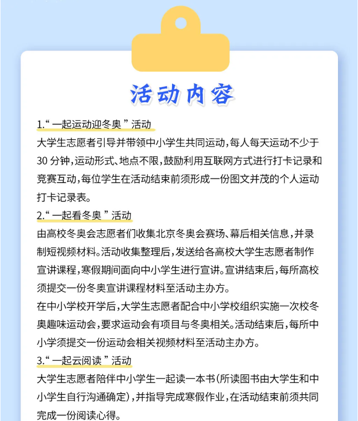 为深入学习贯彻习近平总书记关于北京冬奥会各项工作的重要指示精神,认真贯彻落实全民健身和健康中国国家战略、共青团中央《北京2022年冬奥会和冬残奥会青少年行动计划》,持续提升青少年体质健康水平,进一步在广大青少年中弘扬奥运精神、推广冰雪运动、宣传冬奥文化、持续引导大学生“返家乡”参与实践活动,团中央青年发展部作为支持单位,中国光华科技基金会与共青团北京市委联合举办的“青春爱运动 健康强中国 一起云支教共同迎冬奥”全国大学生2022年寒假“返家乡”社会实践专项活动于2022年1月正式启动了,太阳集团积极响应,报名参加了此次活动,自开始招募志愿者以来,同学们踊跃报名,积极参加,经过筛选,太阳集团选择了成绩优异,有志愿服务经历的105位同学作为志愿者参加此次活动,对口云支教内蒙古通辽实验小学的同学们。活动开展以来,同学们非常珍惜这次难得的实践锻炼机会,学校的领队,执行专员们,都为了此次活动能顺利进行开展了很多准备工作,志愿者们热情饱满、做了充分的准备工作,相信在接下来的一个月时间里一定会圆满完成各项线上支教工作。此次活动分为四个部分,分别是“⼀起运动迎冬奥”、“⼀起看冬奥”、”⼀起云阅读“、”⼀起过个冬奥年“。下面就跟随团团一起去看看吧!