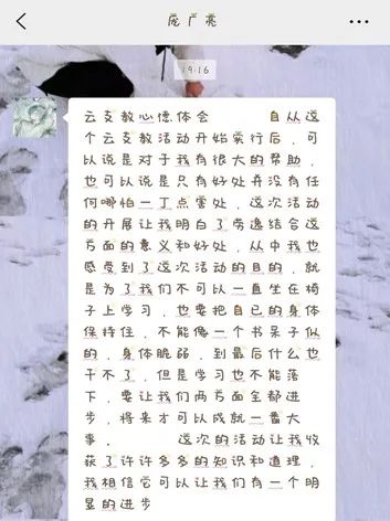 很高兴参加这个云支教活动,认识了大学生支教哥哥,虽然我们没有见过面,但是我们的心却好像连在了一起。他向我讲述自己生活中的经历,告诉我学习的重要性,我要向他学习,将来考上一所大学,不辜负父母和老师对我的期望