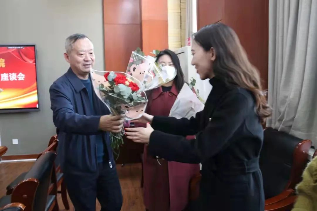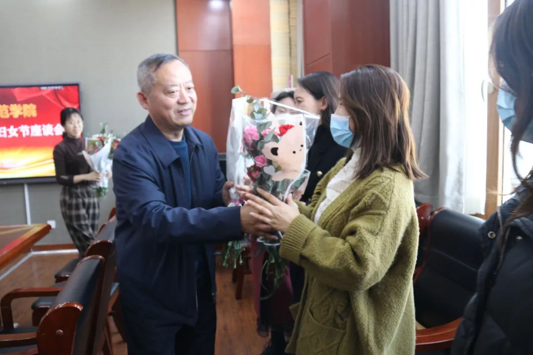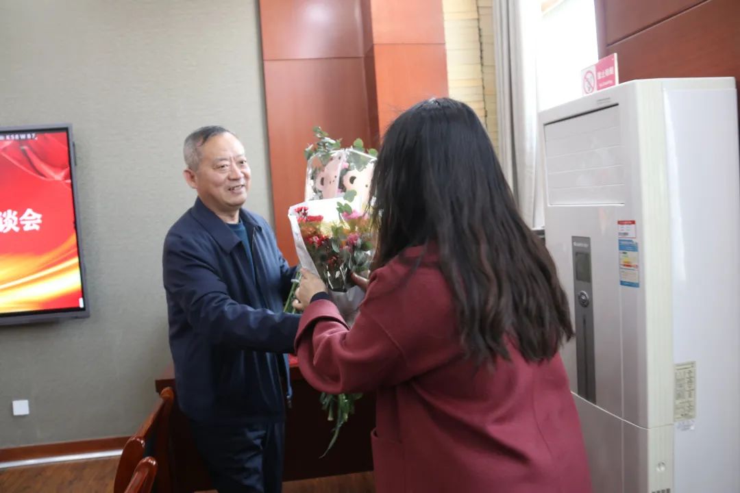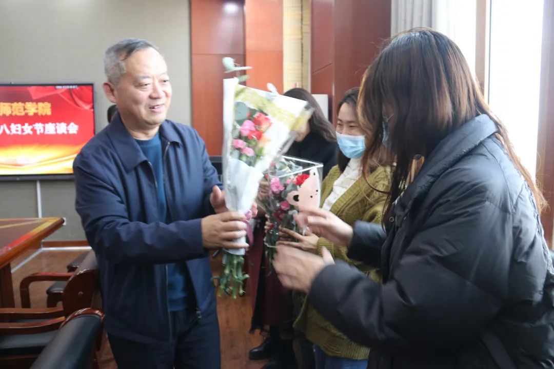 会议开始前,宫建军和工会同志为师院2022年“三八”红旗手送上了鲜花。