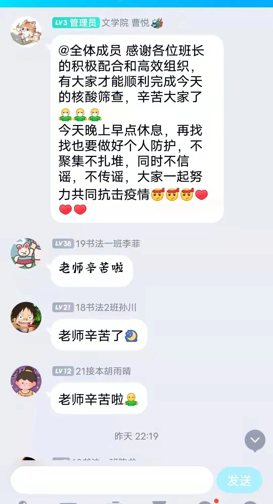疫情的阴霾尚未消散,防控的堡垒仍需巩固。在疫情防控的关键时刻,文学院积极贯彻落实学校疫情防控工作部署,全体师生众志成城、守望相助,用肩膀扛起了责任与担当。相信在全体师生的团结配合下,疫情终将过去,让我们共克时艰,齐盼春来!