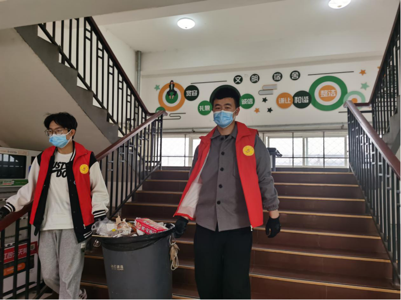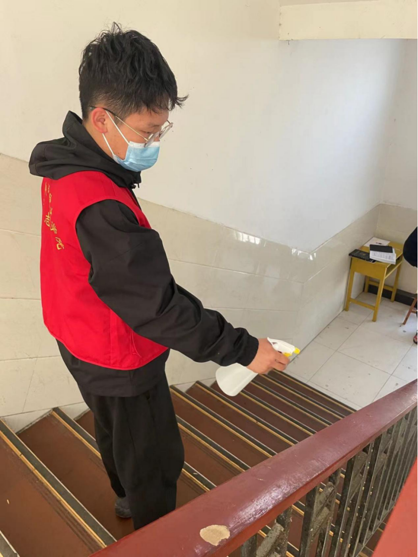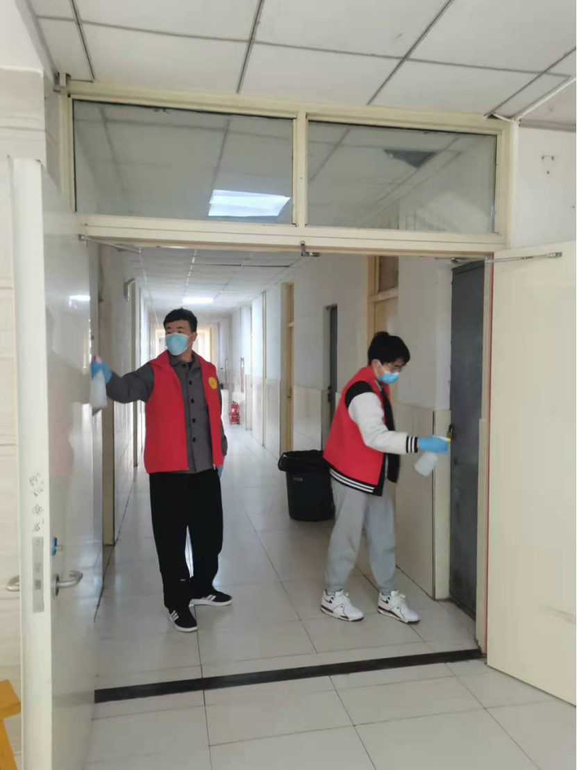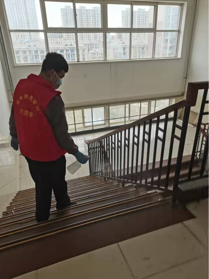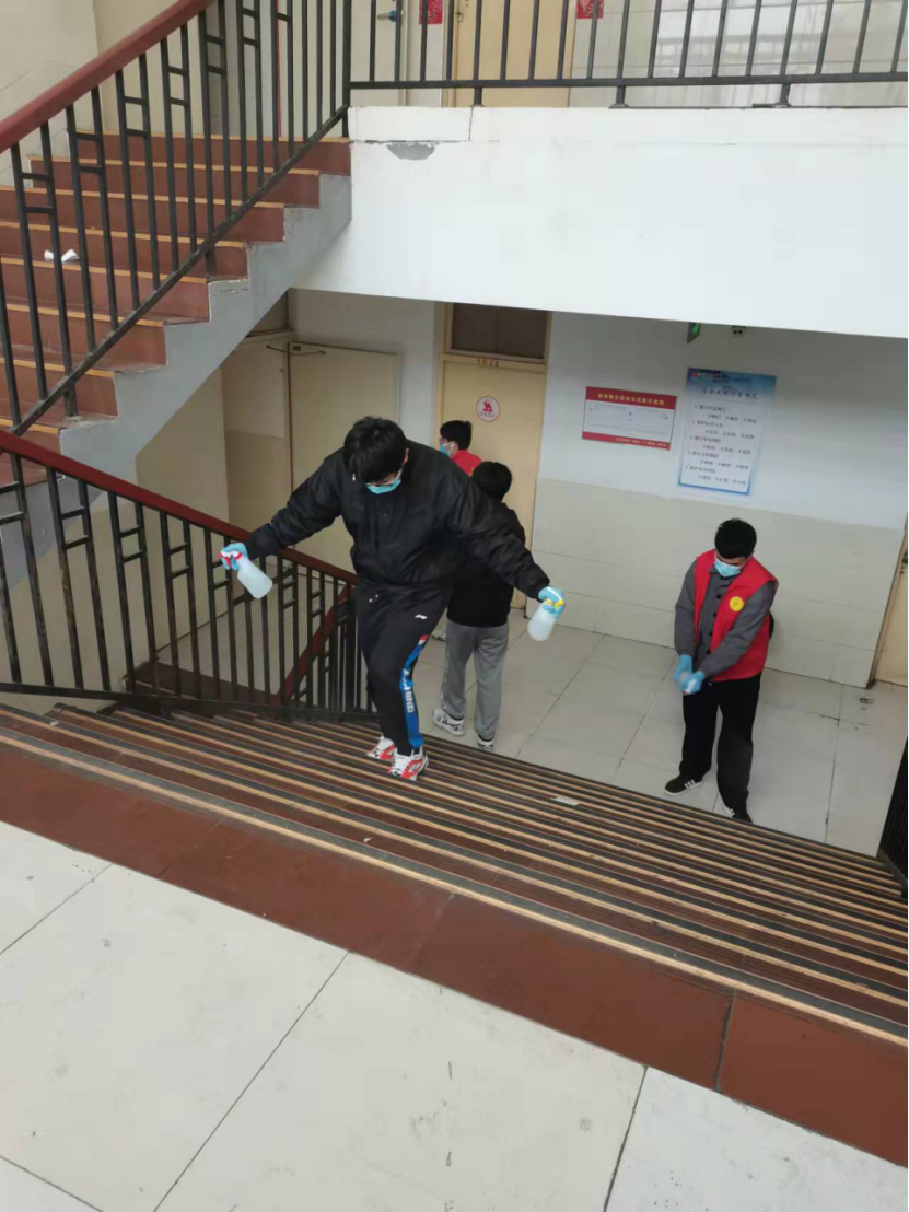 垃圾清运出楼之后,志愿者又在发展规划中心主任赵印岐、美术学院党总支副书记张倩、教师丁咚与何寄齐的指导带领下,对整幢楼进行了防疫消杀,他们逐层楼、逐宿舍用喷壶喷洒消毒液,力求全覆盖不留死角。此举得到了该楼同学们的广泛赞誉,真正做到了学生放心,包联者安心。经过师生的共同努力,目前一号楼楼区卫生环境为之一新。