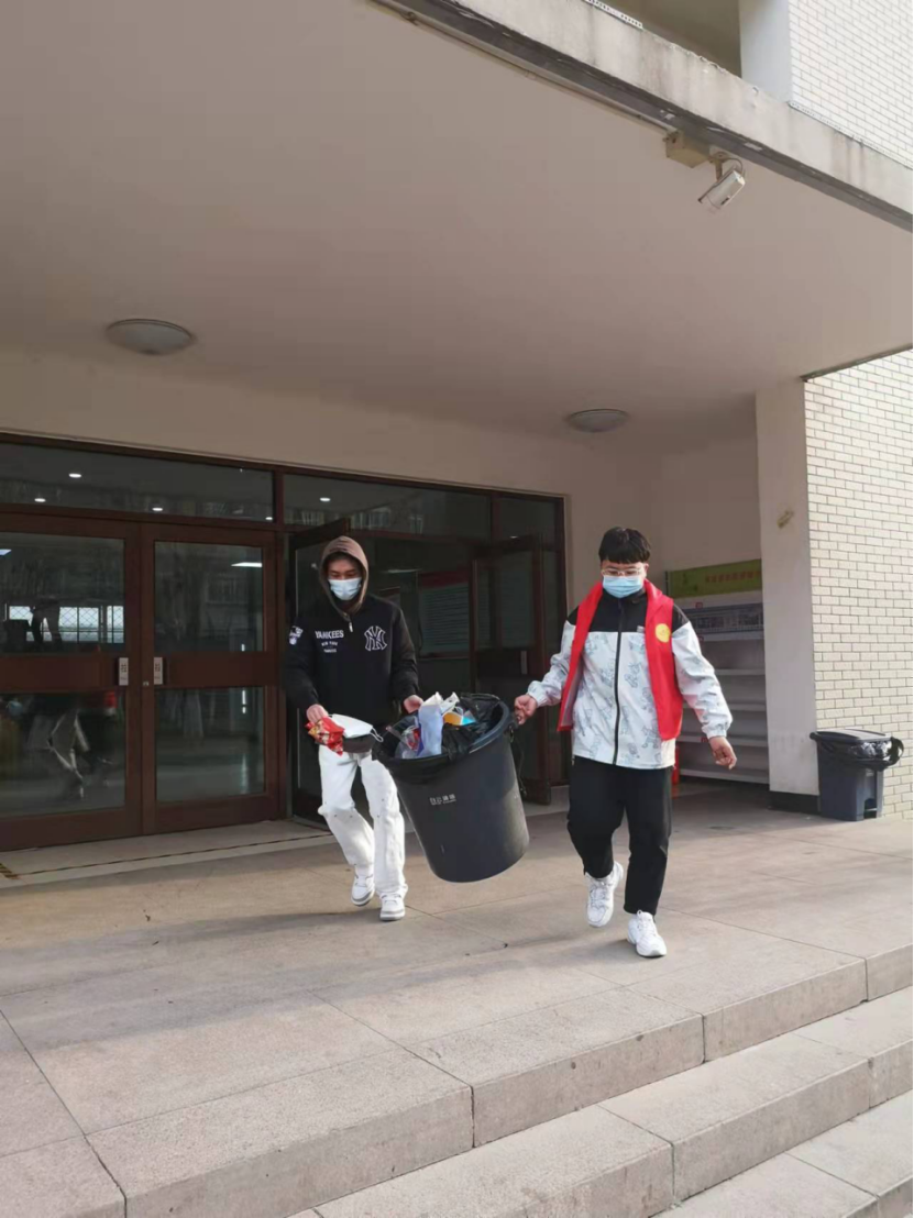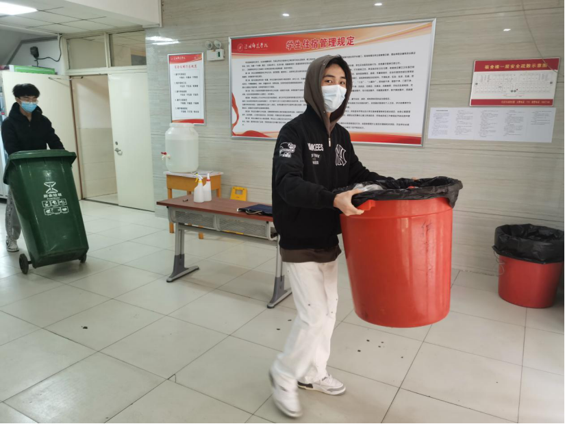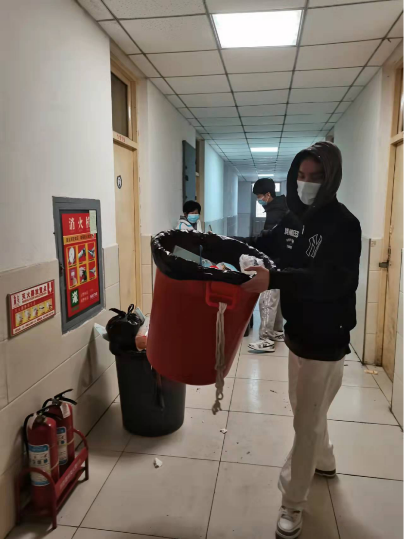 取消堂食,学生打饭回宿舍用餐,楼区内的餐后垃圾也随之增加,并且由于事发突然,校内在岗的保洁人员只有不到应上岗总数的一半,学生宿舍楼卫生清理任务量激增。