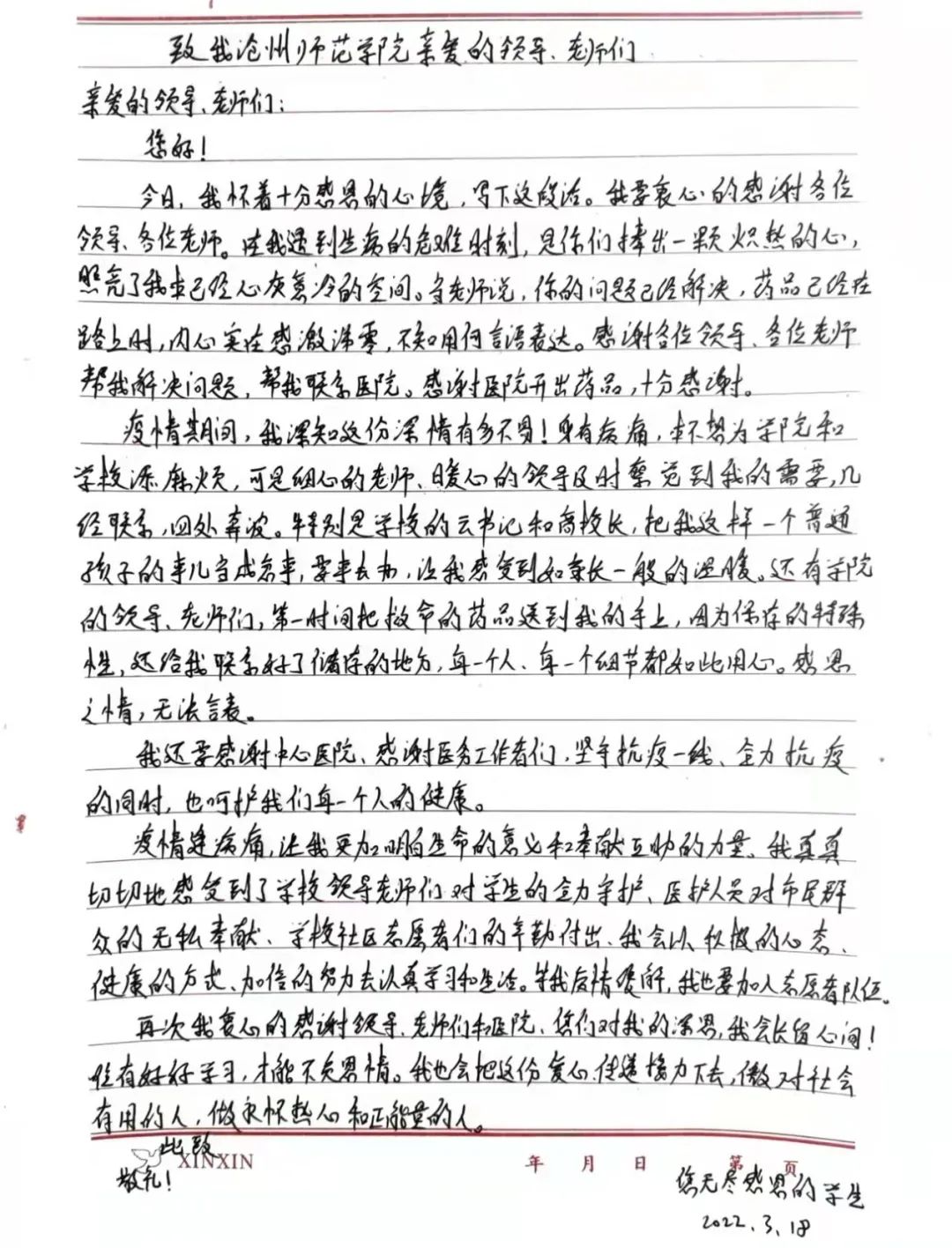 接过救命药的小生感动得热泪盈眶,一字一句地写下了饱含深情的感谢信。信中写到:“疫情逢病痛,让我更加明白的生命的意义和奉献互助的力量。我真真切切地感受到了学校领导老师们对学生的全力守护、医护人员对市民群众的无私奉献、学校社区志愿者们的辛勤付出,我会以积极的心态、健康的方式、加倍的努力去认真学习和生活。”