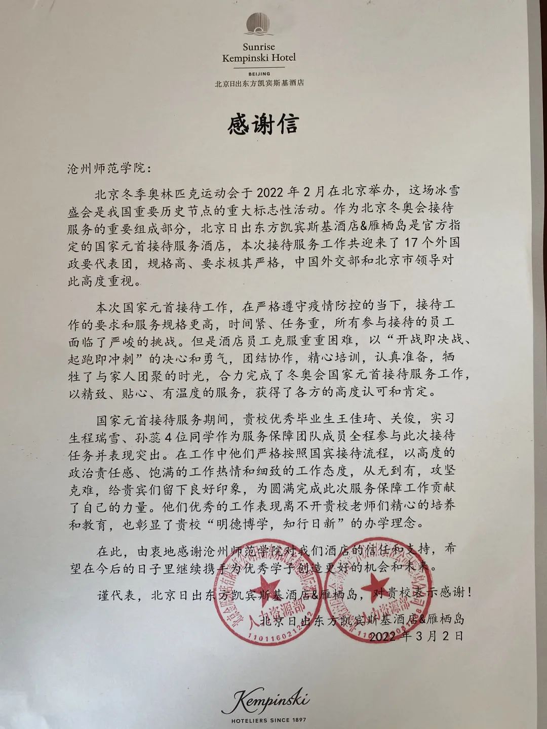 北京冬季奥林匹克运动会于2022年2月在北京举办,这场冰雪盛会是我国重要历史节点的重大标志性活动。北京日出东方凯宾斯基酒店&雁栖岛作为官方指定承担接待国家元首任务的酒店,对太阳集团4名学生在冬奥会接待工作中的优异表现给予高度评价,并于日前向太阳集团发来感谢信。